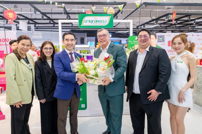 นายสมเกียรติ มรรคยาธร (ที่ 4 จากซ้าย) ประธานเจ้าหน้าที่บริหาร และกรรมการผู้จัดการใหญ่ บริษัท พี อาร์ จี คอร์ปอเรชั่น จำกัด (มหาชน) ผู้บริหารกลุ่มธุรกิจในเครือข้าวมาบุญครอง ศูนย์อาหารเครือฟู้ด เลเจ้นด์ส และโครงการริเวอร์เดล มารีน่า พร้อมด้วยนายกันต์กร นันทพัฒน์สิริ (ที่ 5 จากซ้าย) ผู้อำนวยการฝ่ายค้าปลีกสมัยใหม่ บริษัท ข้าวมาบุญครอง จำกัด ให้การต้อนรับ นายอัศวิน เตชะเจริญวิกุล (ที่ 3 จากซ้าย) ประธานเจ้าหน้าที่บริหาร และกรรมการผู้จัดการใหญ่ บริษัท บิ๊กซี ซูเปอร์เซ็นเตอร์ จำกัด (มหาชน) ที่ให้เกียรติเยี่ยมชมบูธกิจกรรมข้าวมาบุญครอง ภายในพิธีเปิดงาน Big C Rice Fair “ข้าวถุงร่วมใจ ประหยัดทั่วไทย ที่บิ๊กซี” ครั้งที่ 16 ณ บิ๊กซี รัชดาภิเษก