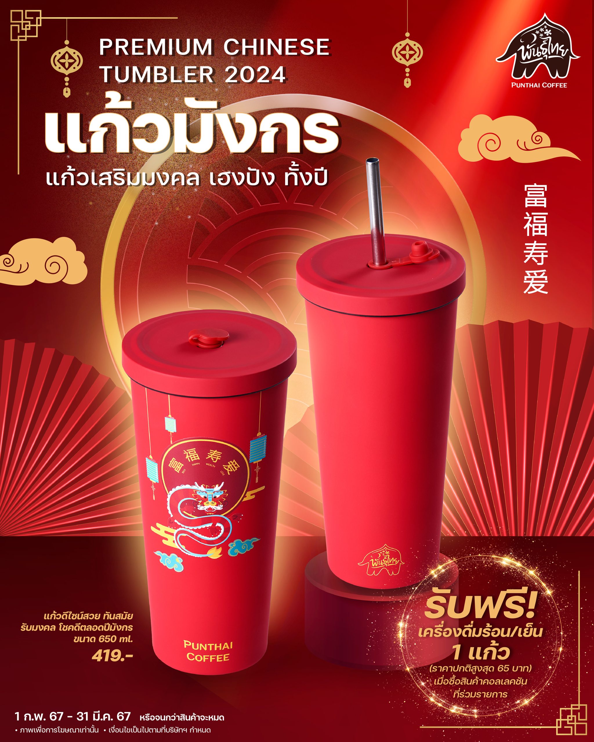 พันธุ์ไทยส่งความเฮงรับปีมังกร มอบคำอวยพรต้อนรับตรุษจีนด้วย “แก้วมังกรพันธุ์ไทย” แก้วทัมเบลอร์สีสันสดใสดีไซน์ลายมังกร เสริมความปังด้วยคำมงคลทั้ง มั่งคั่ง พูนสุข ร่ำรวย รักรุ่ง ผลิตจากวัสดุ Food Grade สแตนเลส 304 ขนาด 650 มล. สามารถเก็บอุณหภูมิได้ทั้งร้อนและเย็น มีฝาจุกเปิด – ปิดช่องใส่หลอดบนฝา มาพร้อมหลอดสแตนเลสและแปรงทำความสะอาดครบชุด ในราคาเพียง 419 บาท พิเศษ! รับฟรีเครื่องดื่มร้อนหรือเย็น 1 แก้ว ราคาปกติสูงสุด 65 บาท เป็นเจ้าของได้แล้ววันนี้ ตั้งแต่วันที่ 1 กุมภาพันธ์ 2567 – 31 มีนาคม 2567 หรือจนกว่าสินค้าจะหมด ที่ร้านกาแฟพันธุ์ไทยทุกสาขาทั่วประเทศ ยกเว้นสาขาท่าอากาศยาน