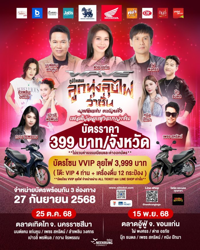 รถจักรยานยนต์ฮอนด้าเวฟ เตรียมยกขบวนความม่วนสู่แดนอีสานกับงาน เวฟออนทัวร์ ‘ลูกทุ่งลุยไฟว่าซั่น’ ขนความสนุกแบบจัดเต็มไปที่จังหวัดนครราชสีมา และจังหวัดขอนแก่น พาชาวฮอนด้าเวฟไปม่วนคักแบบสุดเหวี่ยงกับคอนเสิร์ตศิลปินลูกทุ่งชื่อดังอย่าง ต่าย อรทัย , ไผ่ พงศธร, มนต์แคน แก่นคูน และเปาวลี พรพิมล พร้อมกิจกรรมคาราวานเวฟ ขี่เลาะรอบเมือง และโอกาสได้ใกล้ชิด อินฟลูเอนเซอร์สายขี่เที่ยวลุยอย่าง ‘บอลพาเที่ยว’ และกิจกรรมสนุกๆ ในงานอีกมากมาย เปิดลงทะเบียนร่วมทัพขี่ฮอนด้าเวฟ พร้อมเปิดขายบัตรเข้างานแล้ววันนี้