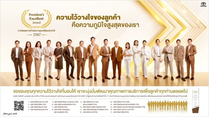 บริษัท โตโยต้า มอเตอร์ ประเทศไทย เล็งเห็นถึงความสำคัญของผู้แทนจำหน่ายโตโยต้า เผยกลยุทธ์สู่ความสำเร็จในการสร้างความไว้วางใจให้กับลูกค้า จาก 17 ผู้แทนจำหน่ายโตโยต้า ที่ได้รับรางวัล 2024 President’s Excellent Award รางวัลอันทรงเกียรติสำหรับผู้แทนจำหน่ายที่มีผลการดำเนินงานอันยอดเยี่ยมในปี 2567 ทั้งด้านยอดขาย การบริการ และความพึงพอใจของลูกค้า