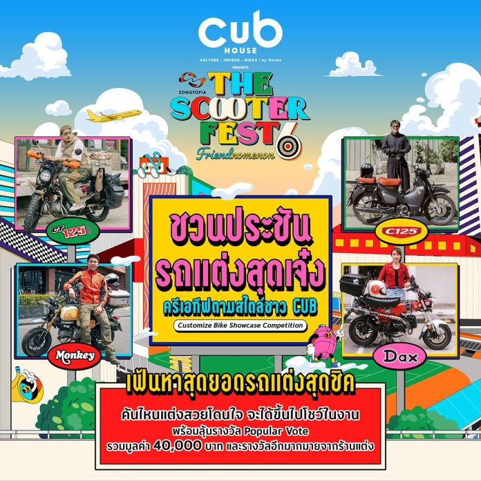 ทั้งนี้ รถที่เข้าร่วมจะต้องเป็นรถจักรยานยนต์ Honda CT125, Dax, Monkey หรือ C125 โดยทีมงานจะคัดเลือกรถแต่งที่โดดเด่น 70 คันเพื่อนำมาจัดแสดงในงาน ‘CUB House Presented The Scooter Fest #6’ พร้อมร่วมกิจกรรม Popular Vote โดยผู้ร่วมงานจะเป็นผู้โหวตรถแต่งที่ชื่นชอบที่สุดในแต่ละรุ่น