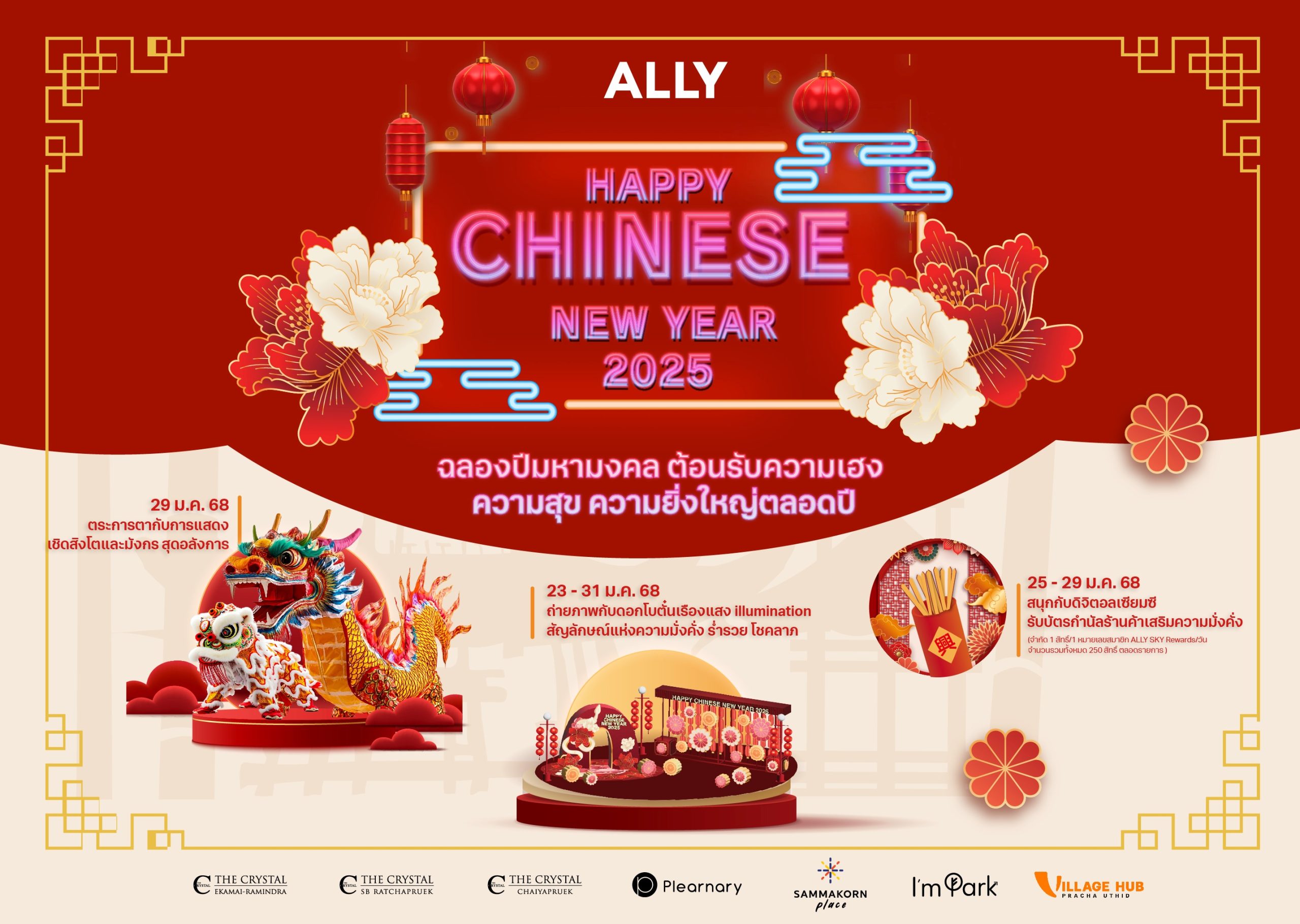 ศูนย์การค้าในเครืออัลไล (ALLY) ชวนทุกท่านร่วมฉลองเทศกาลตรุษจีนต้อนรับปีมหามงคลในงาน “ALLY HAPPY CHINESE NEW YEAR 2025 ฉลองปีมหามงคล ต้อนรับความเฮง ความสุข ความยิ่งใหญ่ตลอดปี” พบความตื่นตาตื่นใจ โชว์เชิดมังกรพ่นไฟและสิงโตสุดยิ่งใหญ่ จากคณะสิงโตมังกรทอง ลูกชัยมงคล หนึ่งในคณะที่เก่าแก่ที่สุดในประเทศไทย พร้อมสัมผัสความงดงามของดอกโบตั๋นเรืองแสงสไตล์ illumination ที่รังสรรค์ขึ้นเพื่อสื่อถึงความมั่งคั่ง ร่ำรวย และโชคลาภ เพื่อสร้างความประทับใจและเสริมสิริมงคลให้กับทุกท่าน