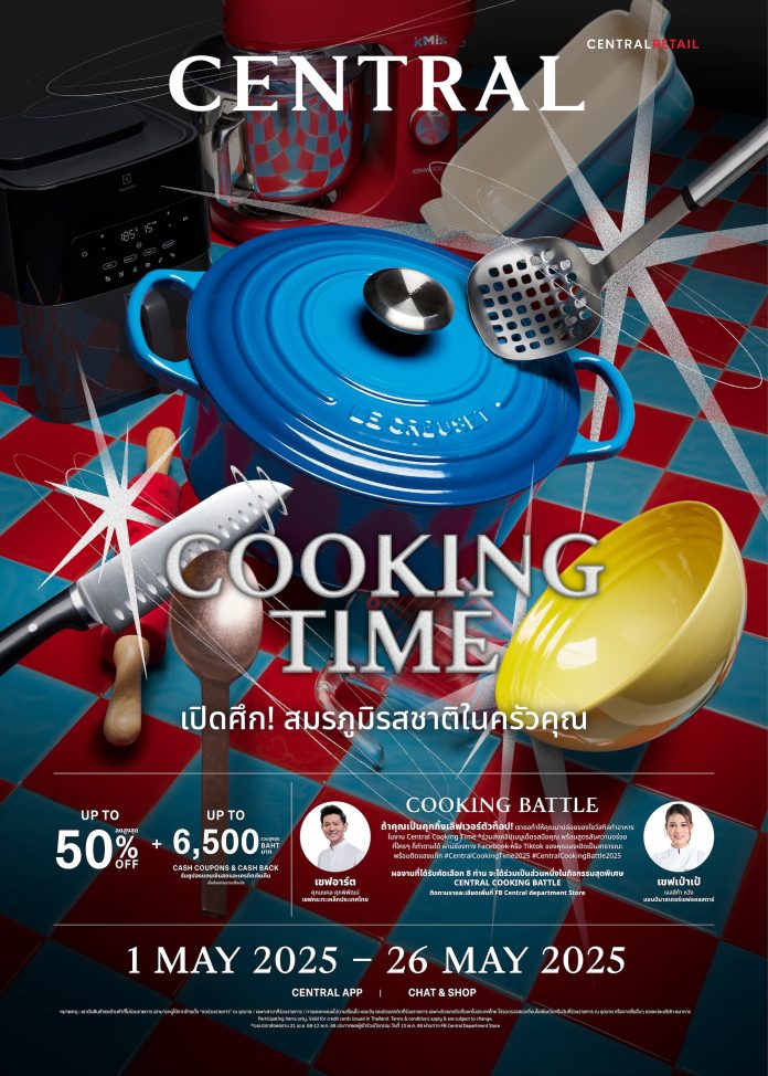 ห้างเซ็นทรัล ในเครือเซ็นทรัล รีเทล เดสติเนชันแห่งการสร้างแรงบันดาลใจในทุกช่วงเวลาของชีวิต ตอกย้ำที่สุดแห่งความครบครันของแผนกเครื่องครัวจากแบรนด์ชั้นนำ จัดแคมเปญ “Central Cooking Time” (เซ็นทรัล คุกกิ้ง ไทม์) ที่มาพร้อมโปรโมชันสุดคุ้ม ลดสูงสุดถึง 50% พร้อมรับคูปองแทนเงินสดและเครดิตเงินคืนรวมสูงสุด 6,500 บาท เมื่อช้อปตามเงื่อนไขที่กำหนด และพิเศษ! ห้างเซ็นทรัล ร่วมกับแบรนด์ชั้นนำ อาทิ Meyer, Tefal, WMF และ Zwilling มอบประสบการณ์ Fine Dining สุดเอ็กซ์คลูซีฟแก่ลูกค้าคนพิเศษในบรรยากาศและบริการที่เต็มไปด้วยความพิเศษแบบเหนือระดับ และใส่ใจในทุกรายละเอียด เฉพาะงานนี้เท่านั้น เมื่อช้อปครบตามเงื่อนไข ตั้งแต่วันที่ 1 พ.ค. 68 – 26 พ.ค. 68 ที่แผนกบ้าน ห้างเซ็นทรัลทุกสาขา และทุกช่องทางการช้อปปิ้งสุดสะดวกของห้าง ไม่ว่าจะเป็น Central Chat & Shop, Central Personal Shopper On Demand ผู้ช่วยส่วนตัวสำหรับทุกคน Central App และเว็บไซต์ www.central.co.th ตลอด 24 ชั่วโมง  รวมทั้ง  Facebook Page: Central Department Store