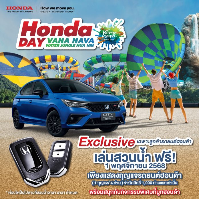 ฮอนด้า จัดใหญ่แบบเต็ม Max ให้ครอบครัวฮอนด้าได้สนุกสุดมันส์ใน Honda Day 2025 ในวันที่ 1 พฤศจิกายน 2568 ที่สวนน้ำ วานา นาวา หัวหิน กับเครื่องเล่นสวนน้ำมาตรฐานโลกกว่า 19 เครื่องเล่น และสไลเดอร์มากมาย ในบรรยากาศสวนน้ำสไตล์ป่าเขตร้อนแห่งแรกของเอเชีย