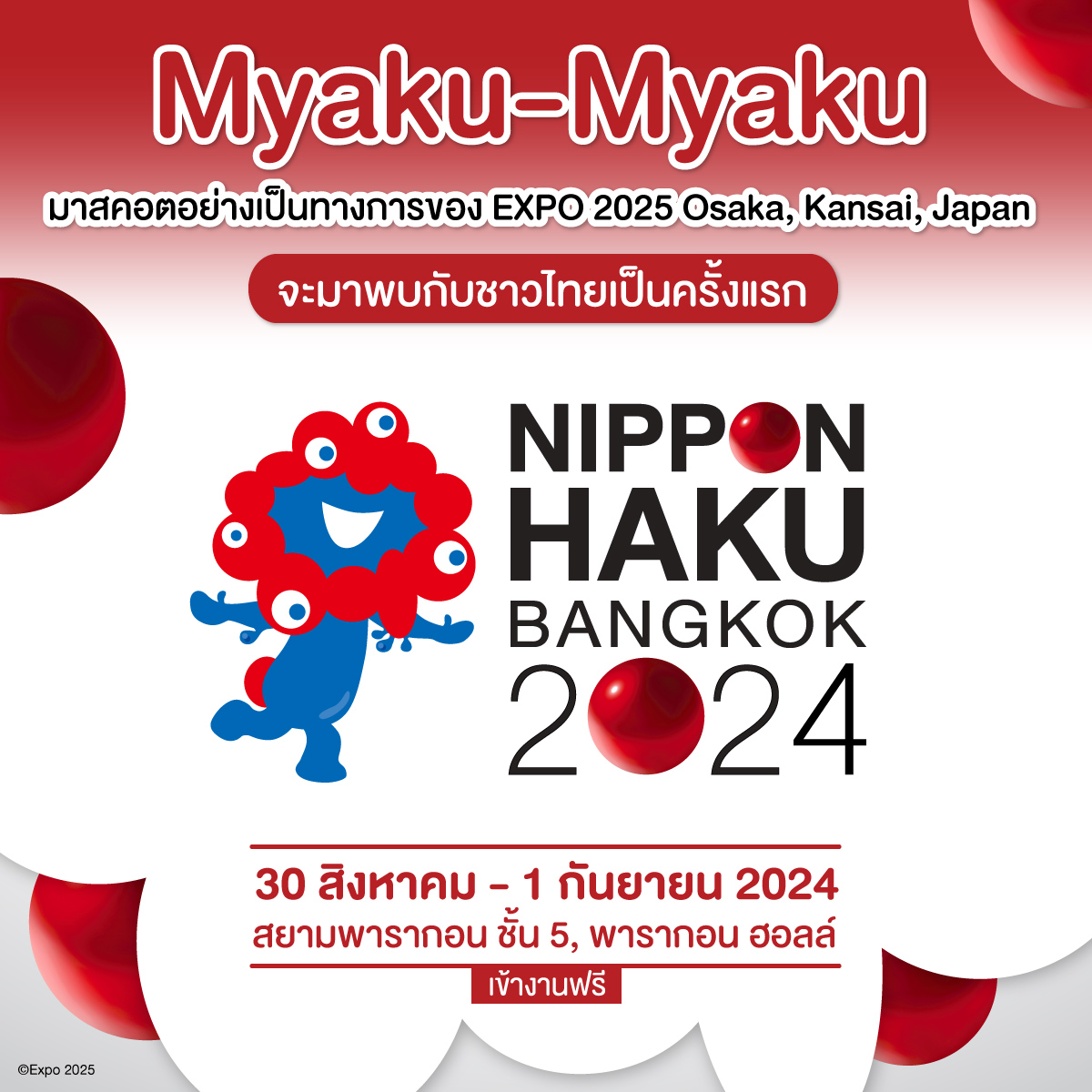 เตรียมมาร่วมเป็นส่วนหนึ่ง ในงาน NIPPON HAKU BANGKOK 2024 พร้อมร่วมสัมผัสและเรียนรู้เกี่ยวกับงานมหกรรมโลก EXPO 2025 Osaka, Kansai, Japan ที่กำลังเกิดขึ้นในปี 2025 และร่วมกิจกรรมสุดพิเศษแบบใกล้ชิดกับ เมียะคุ เมียะคุ (Myaku-Myaku) อีกด้วย