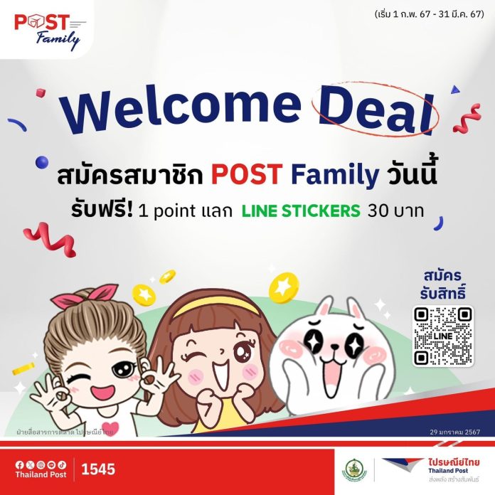 บริษัท ไปรษณีย์ไทย จำกัด ยกระดับความพิเศษรับปีมังกร จัดโปรโมชันสุดคุ้มต้อนรับสมาชิกใหม่ POST Family รับ 1 คะแนน แลกรับสติกเกอร์ไลน์คอลเลกชันสุดน่ารักมูลค่า 30 บาท ฟรี และพิเศษ ! กับการขยายเวลาเซฟค่าส่งของทั่วไทย หรือจะส่งไกลทั่วโลกแบบจุใจด้วยการเปลี่ยนคะแนนสะสมเป็นส่วนลดค่าส่งตั้งแต่ 100 – 1,000 บาท จนถึงวันที่ 31 มีนาคม 2567 พร้อมทั้งได้รับสิทธิประโยชน์อื่น ๆ อีกแบบจัดเต็มตลอดทั้งปี