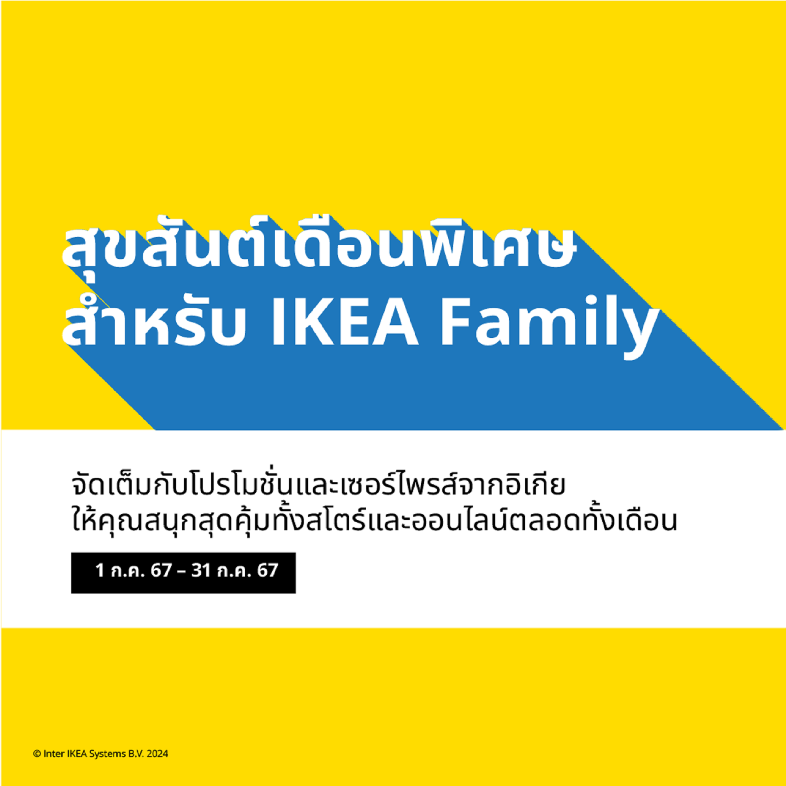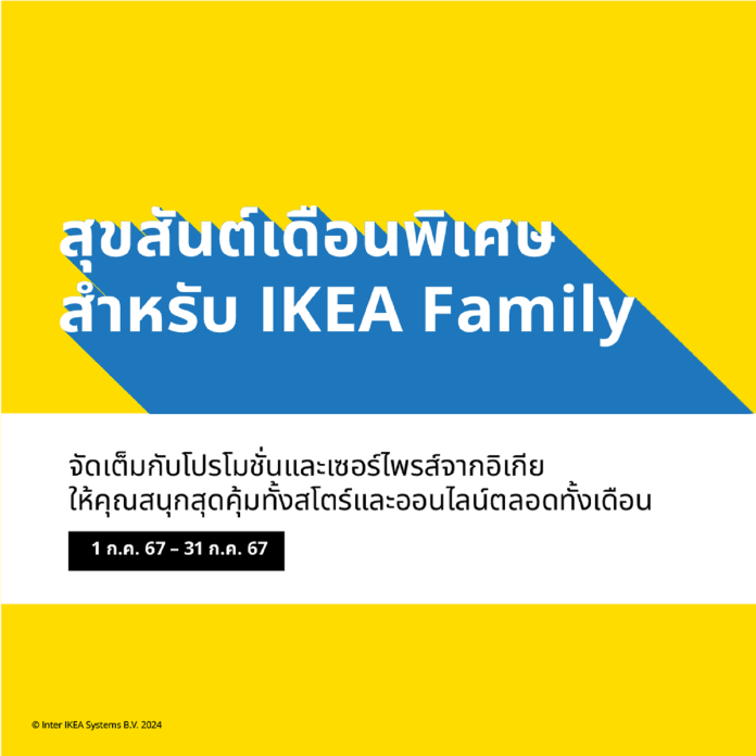 อิเกีย ประเทศไทย ต้อนรับ IKEA Family Month สุขสันต์เดือนพิเศษสำหรับสมาชิก IKEA Family ยกขบวนกิจกรรมให้สมาชิกได้ร่วมสนุก ลุ้นรับของรางวัลสุดเซอร์ไพรส์ พร้อมช้อปเพลินกับส่วนลดสินค้าสำหรับสมาชิกสุดคุ้มสูงสุดกว่า 60% รับคะแนน 2 เท่า เมื่อช้อปรวมขั้นต่ำ 20,000 บาท อีกทั้งยังได้อิ่มอร่อยกับอาหารจานโปรดในราคาที่ลดลง และเข้าร่วมเวิร์คช็อปสุดพิเศษสำหรับสมาชิก IKEA Family เท่านั้น ตั้งแต่วันที่ 1 – 31 กรกฎาคม ที่สโตร์ อิเกีย หรือผ่านช่องทางออนไลน์ IKEA.co.th