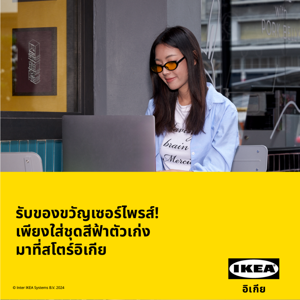 • สุดสัปดาห์ แต่งฟ้ามาเจอกัน เพียงแต่งตัวด้วยชุดสีฟ้าตัวโปรด ไม่ว่าจะเป็นเสื้อ กระโปรงหรือกางเกง มาเดินอิเกียวันเสาร์และอาทิตย์ ตลอดเดือนกรกฎาคม พร้อมแสดงบัตรสมาชิก IKEA Family หรือ eCard รับไปเลยของขวัญสุดเซอร์ไพรส์ที่สโตร์อิเกีย[3]