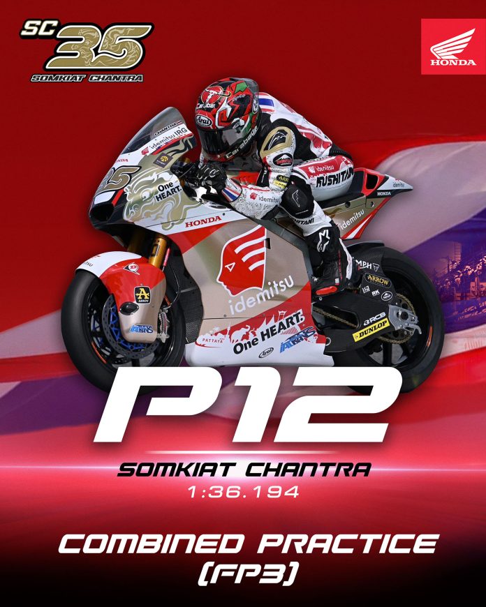 “ก้อง” สมเกียรติ จันทรา ยอดนักบิดไทยจากโครงการ “ฮอนด้า เรซ ทู เดอะ ดรีม” รั้งอันดับ 12 เวลารวมจากการซ้อม 3 ครั้ง ด้วยเวลาต่อรอบ 1 นาที 36.194 วินาที ตีตั๋วเข้าสู่การควอลิฟายรอบ Q2 แบบอัตโนมัติ ในศึก โมโตทู เวิลด์ แชมเปี้ยนชิพ 2023 สนาม 17 รายการ โออาร์ ไทยแลนด์ กรังด์ปรีซ์ หลังผ่านการซ้อมครั้งที่ 3 เมื่อเช้าวันเสาร์ที่ 28 ตุลาคมนี้ ที่ สนามช้าง อินเตอร์เนชั่นแนล เซอร์กิต