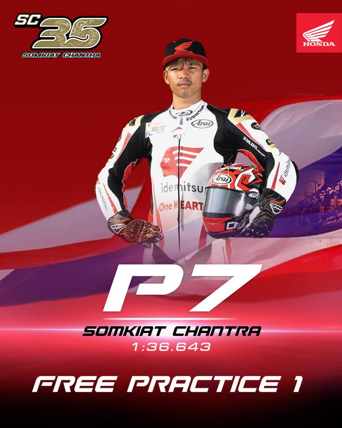 “ก้อง” สมเกียรติ จันทรา ยอดนักบิดไทยจากโครงการ “ฮอนด้า เรซ ทู เดอะ ดรีม” ประเดิมลงซ้อมครั้งแรกในศึก โมโตทู เวิลด์ แชมเปี้ยนชิพ 2023 สนาม 17 รายการ โออาร์ ไทยแลนด์ กรังด์ปรีซ์ ด้วยการกดเวลารั้งท็อป 7 ในการซ้อมครั้งแรกของ “โฮมเรซ” ด้วยเวลาต่อรอบ 1 นาที 36.643 วินาที ตามหลังจ่าฝูงเพียง 0.377 วินาที เมื่อช่วงเช้าวันศุกร์ที่ผ่านมา ที่ สนามช้าง อินเตอร์เนชั่นแนล เซอร์กิต จ.บุรีรัมย์