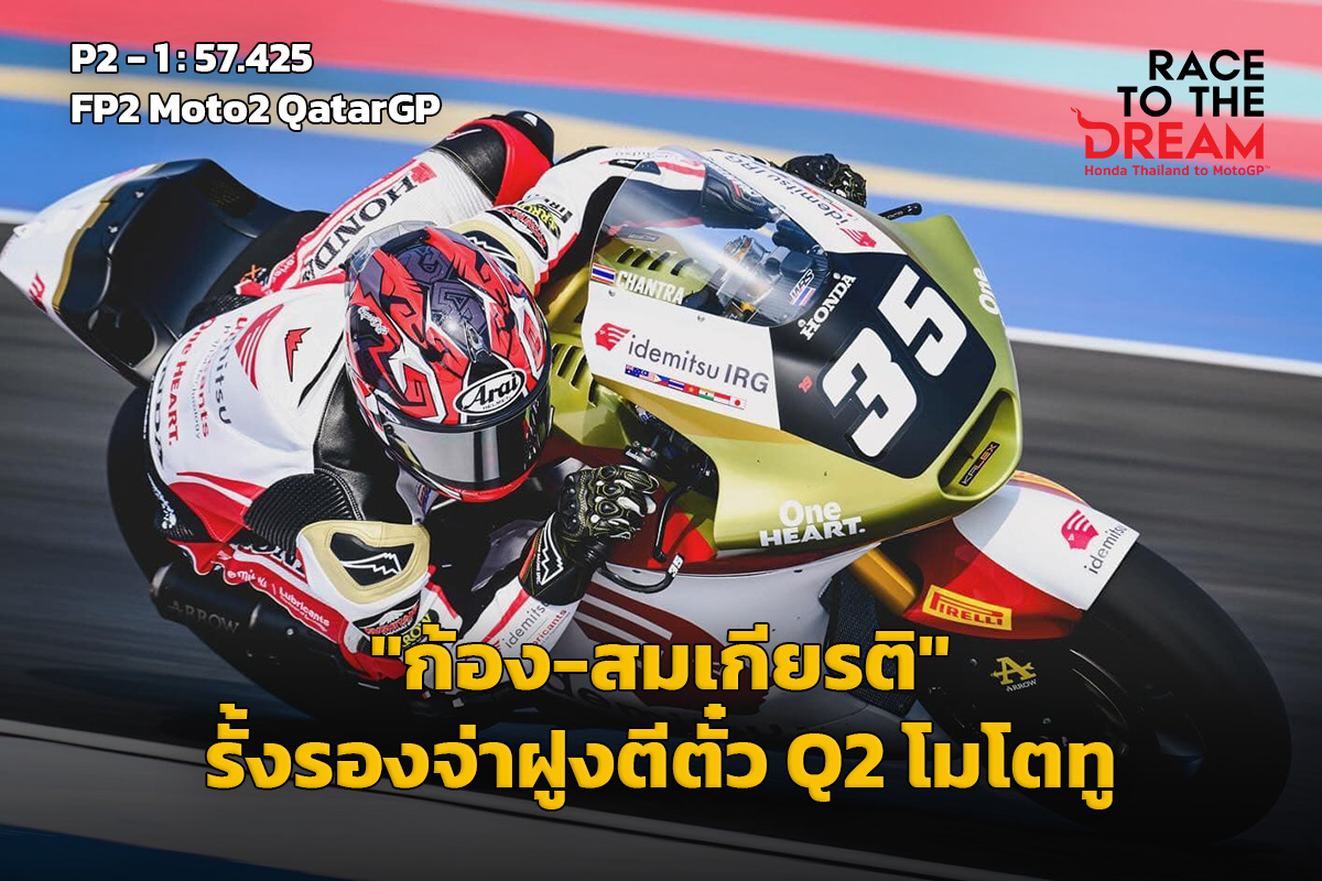 “ก้อง” สมเกียรติ จันทรา ยอดนักบิดขวัญใจชาวไทยร้อนแรงต่อเนื่อง ควบรถแข่งคู่ใจหมายเลข 35 กดเวลาสุดโหดรั้งรองจ่าฝูงการซ้อมรอบ FP2 ในศึก โมโตทู เวิลด์ แชมเปี้ยนชิพ 2024 สนามแรก กาตาร์ กรังด์ปรีซ์ ตีตั๋วเข้าสู่การควอลิฟายรอบ Q2 แบบอัตโนมัติ ด้วยเวลาต่อรอบ 1 นาที 57.425 วินาที