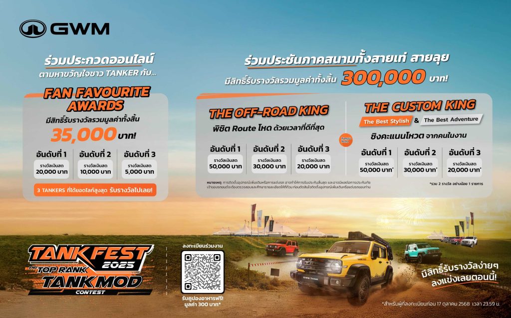 GWM (Thailand) ยกระดับสู่การเป็นแบรนด์รถยนต์ที่มีผลิตภัณฑ์ครอบคลุมทุกประเภทพลังงานที่ตอบสนองความต้องการของผู้ใช้งานทั่วทุกมุมโลก ด้วยแนวคิด “ครอบคลุมทุกการใช้งาน (All Scenarios) ด้วยผลิตภัณฑ์ที่ครอบคลุมทุกพลังงาน (All Powertrains) สู่การตอบสนองทุกกลุ่มผู้ใช้งานอย่างแท้จริง (All Users)” จากความสำเร็จของตระกูลรถออฟโรดทั้ง GWM TANK 300 และ GWM TANK 500 ที่ได้รับการตอบรับอย่างล้นหลามตั้งแต่เปิดตัว สู่จำนวน TANKER หรือผู้ใช้จริงที่เติบโตอย่างก้าวกระโดด เพื่อเป็นการขอบคุณลูกค้าชาวไทยทั่วประเทศและเนื่องในโอกาสเฉลิมฉลองการส่งมอบ NEW GWM TANK 300 DIESEL ครบ 5,000 คัน ปลุกกระแสคนรักรถ GWM TANK และการตกแต่ง รวมถึงเอาใจสายซิ่ง สายลุย และสายโหด GWM จึงจัดมหกรรมเฟสติวัลสุดยิ่งใหญ่ TANK FEST 2025 and TOP RANK TANK MOD” ครั้งแรกในไทย เนรมิตพื้นที่ขนาดมหึมาเกือบ 50,000 ตารางเมตร ให้เป็นลานกิจกรรมสุดเร้าใจ เปิดพื้นที่สำหรับแฟนพันธุ์แท้ GWM TANK ทั้งสายออฟโรดและสายชิลล์ผู้ที่ชื่นชอบการแต่งรถให้เป็นพื้นที่ได้ปล่อยของ ปลดปล่อยจินตนาการ และความคิดสร้างสรรค์ได้อย่างไร้ขีดจำกัด ผ่านกิจกรรมความสนุกที่อัดแน่นในทุกตารางนิ้ว ทั้งเวทีประกวดและจัดแสดงรถแต่ง การแข่งขันการขับขี่ออฟโรดสุดครีเอทีฟ สนามเทสต์สมรรถนะ GWM TANK กิจกรรมความสนุกอีกมากมาย พร้อมรับของที่ระลึกติดไม้ติดมือกลับบ้าน การันตีความอร่อยตลอดวันด้วยสตรีทฟู้ดกับ Food truck เจ้าดังจำนวนมาก รับชมการแสดงดนตรีคลอเคล้าบรรยากาศจากวงดนตรีชื่อดังตั้งแต่เช้าจรดเย็น พร้อมตบท้ายด้วยคอนเสิร์ตจากศิลปินชื่อดังยามค่ำคืน สำหรับผู้ที่สนใจทุกคนเข้าร่วมงานฟรีแบบไม่มีค่าใช้จ่าย จะมาคนเดียว มาเป็นคู่ เป็นแก๊งค์ หรือยกขบวนทั้งครอบครัว ปักหมุดแล้วมาเจอกัน วันเสาร์ที่ 18 ตุลาคม 2568 ณ ESC Park รังสิต จ.ปทุมธานี และวันอาทิตย์ที่ 19 ตุลาคม 2568 สำหรับผู้ที่สนใจทดลองขับ GWM