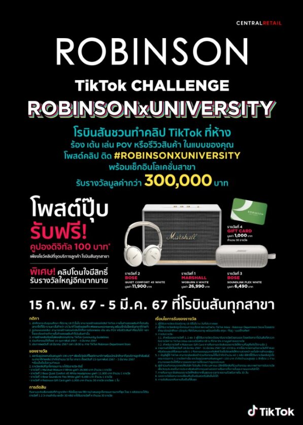 โอกาสดี ๆ ของเหล่าอินฟลูเอนเซอร์นิวเจน! ห้างสรรพสินค้าโรบินสัน ในเครือเซ็นทรัล รีเทล จัดกิจกรรมสุดสร้างสรรค์ TikTok CHALLENGE #ROBINSONxUNIVERSITY ชวนน้อง ๆ นักศึกษาทั่วประเทศที่มีอายุ 18 ปีขึ้นไป ร่วมครีเอตผลงานคลิปสั้นส่งเข้าประกวดบนแพลตฟอร์มยอดนิยมอย่าง TikTok ชิงของรางวัลรวมมูลค่ากว่า 300,000 บาท เพียงครีเอตคลิป TikTok ทั้งร้อง เต้น เล่น POV หรือรีวิวสินค้าในแบบฉบับของตัวเองที่ห้างโรบินสันสาขาใดก็ได้