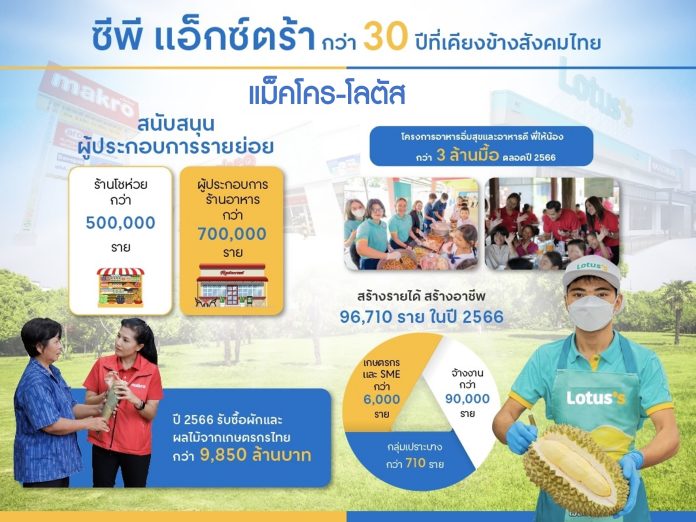 โดยในปี 2566 ที่ผ่านมามียอดรับซื้อผัก-ผลไม้จากเกษตรกรกว่า 9,800 ล้านบาท เพื่อจำหน่ายผ่าน 2,800 สาขาของแม็คโคร-โลตัส ที่มีสาขาทั่วประเทศ ทั้งนี้ ซีพี แอ็กซ์ตร้า เดินหน้าสนับสนุนเกษตรกรในหลายมิติ ทั้งการจัดอบรมเพิ่มทักษะความรู้ให้กับเกษตรกร รวมถึงส่งเสริมผู้ประกอบการรายย่อย ช่วยต่อยอดในการพัฒนาสินค้า สร้างมาตรฐานเพื่อให้สามารถนำเข้าจำหน่ายในห้างโมเดิร์นเทรดได้
