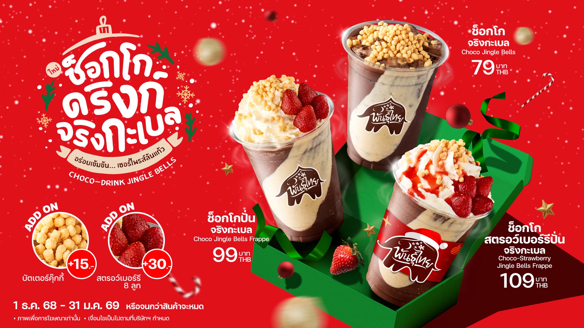 ความสดใสของเทศกาลที่แท้ทรูกับช็อกโกแลตหน้าล้น ดับเบิ้ลท็อปปิ้งได้ตามใจ พิเศษ! เพิ่มบัตเตอร์คุ๊กกี้ เพียง 15.- หรือ สตรอว์เบอร์รี 7-8 ลูก (ตามน้ำหนัก) เพียง 30.- อร่อยฟินถ่ายรูปสวยกับช็อกโกเข้ม จัดเต็มความเซอร์ไพรส์แบบจริงกะเบล! ตั้งแต่วันที่ 1 ธันวาคม 2568 – 31 มกราคม 2569 หรือจนกว่าสินค้าจะหมด ที่ร้านพันธุ์ไทยทุกสาขาทั่วประเทศ และบริการเดลิเวอรี ส่งตรงความสุขถึงบ้าน