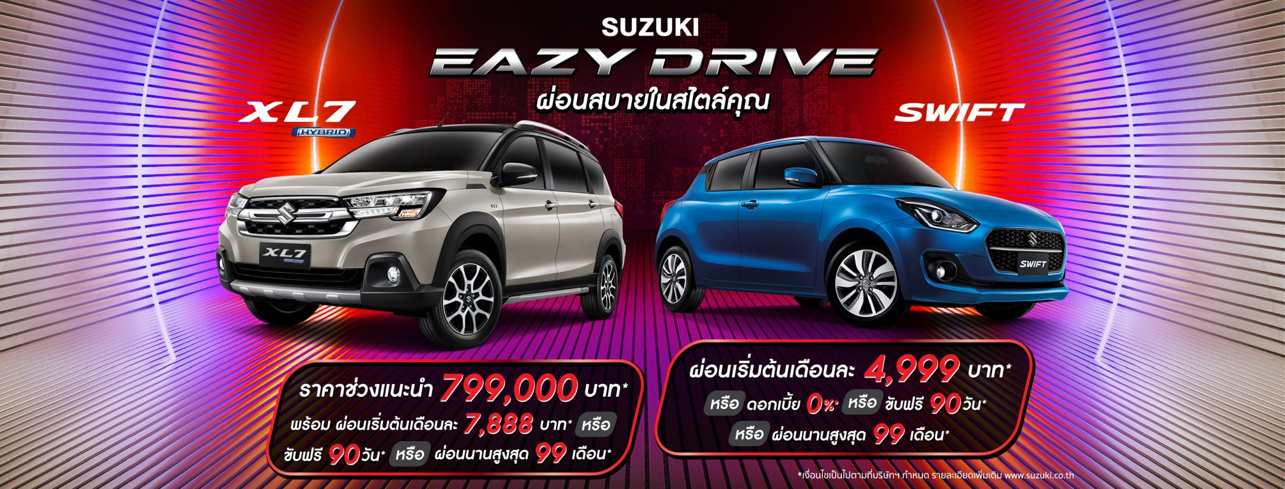อย่างไรก็ตาม ผู้ที่มีความสนใจและต้องการเป็นเจ้าของรถทุกรุ่นภายใต้แบรนด์ของซูซูกิ เรายังคงเป็นพันธมิตรกับสถาบันการเงินที่ร่วมโครงการเพื่อรองรับและอำนวยความสะดวกด้านการอนุมัติสินเชื่อเพื่อเช่าซื้อให้แก่ลูกค้า ทั้งนี้ รายละเอียด และเงื่อนไขต่างๆ เป็นไปตามที่บริษัทฯ กำหนด ลูกค้าที่สนใจสามารถเยี่ยมชมและสอบถามรายละเอียดเพิ่มเติมได้ที่โชว์รูมรถยนต์ซูซูกิทั่วประเทศ