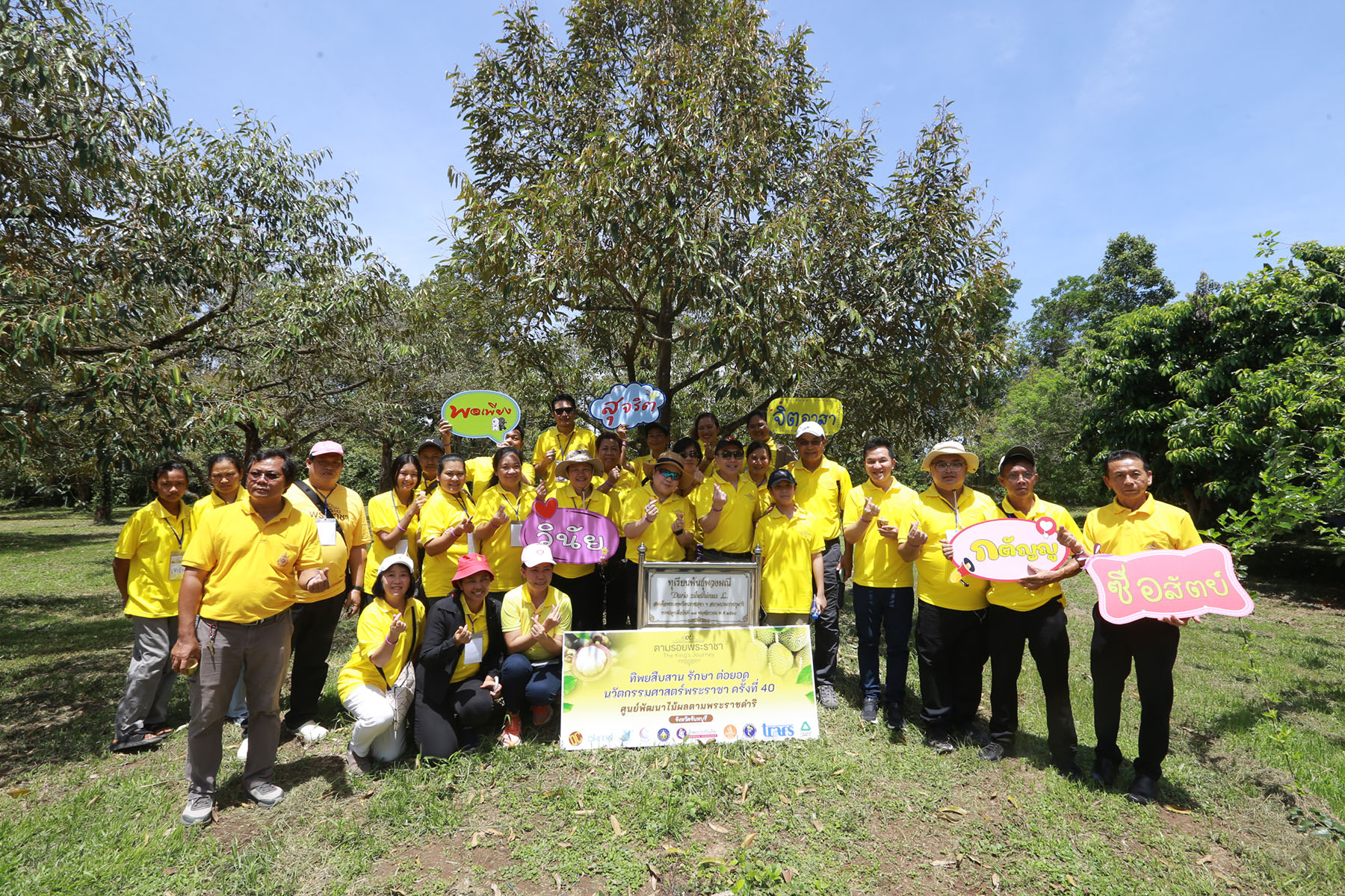 โดยคณะฯ ได้เรียนรู้การทำสวนผลไม้เศรษฐกิจ อาทิ ทุเรียน มังคุด เงาะ ด้วยเกษตรอินทรีย์ปลอดสารเคมีตามหลักปรัชญาเศรษฐกิจพอเพียง และได้ลองชิมผลไม้สด ๆ จากต้น ซึ่งมี ทุเรียนทรงปลูก พันธุ์พวงมณีของสมเด็จพระกนิษฐาธิราชเจ้า กรมสมเด็จพระเทพรัตนราชสุดาฯ สยามบรมราชกุมารีด้วย พร้อมกับได้ศึกษาการทำเกษตรทฤษฎีใหม่ของในหลวงรัชกาลที่ 9 ที่มีแนวทางการจัดสรรพื้นที่ออกเป็น 4 ส่วน ตามอัตราส่วน 30:30:30:10 แบ่งเป็น