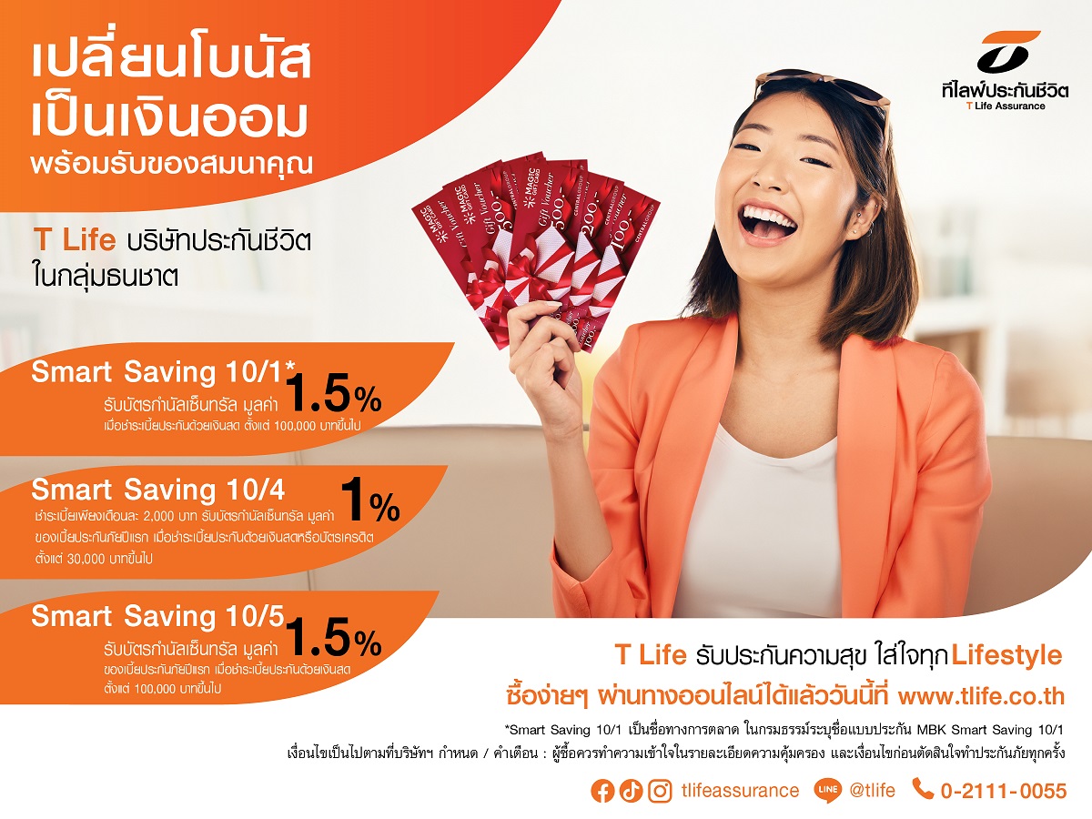 ที ไลฟ์ ประกันชีวิต เปิดตัวแคมเปญ “เปลี่ยนโบนัสเป็นเงินออม” เชิญชวนนำเงินโบนัสประจำปีมาวางแผนทางการเงิน กับแบบประกันออมทรัพย์ Smart Saving 10/1, 10/4 และ 10/5 ผ่านช่องทางออนไลน์ ได้รับผลตอบแทนสูง ลดหย่อนภาษีได้ พร้อมสิทธิประโยชน์พิเศษ! รับบัตรกำนัลเซ็นทรัล ตั้งแต่วันนี้ถึง 30 เมษายน 2568