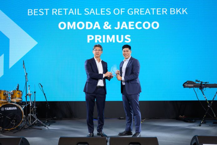 เมื่อเร็วๆ นี้ นายณัฏฐวุฒิ ตั้งคารวคุณ (ซ้าย) ประธาน บริษัท ไพรม์มัส โอแอนด์เจ พระราม 9 จำกัด และ บริษัทในเครือ “ไพรม์มัส กรุ๊ป” ให้เกียรติขึ้นรับรางวัล “Best Retail Sales of Greater BKK 2024” จากนายพิชณุตย์ วงศ์พัฒนาสิน (ขวา) รองประธานฝ่ายขายและการตลาด บจก.โอโมดา แอนด์ เจคู (ประเทศไทย) ในงานประชุมผู้จำหน่ายรถยนต์ OMODA & JAECOO ในประเทศไทย ภายใต้ชื่องาน “OMODA & JAECOO Dealer Conference 2568” จัดขึ้นโดย บจก.โอโมดา แอนด์ เจคู (ประเทศไทย) ณ โรงแรมมิลเลนเนียม ฮิลตัน กรุงเทพฯ