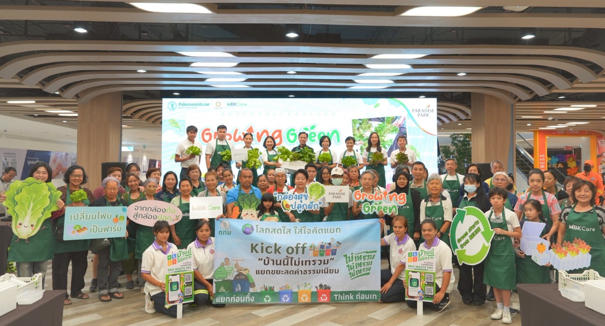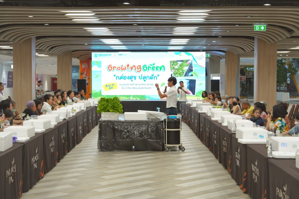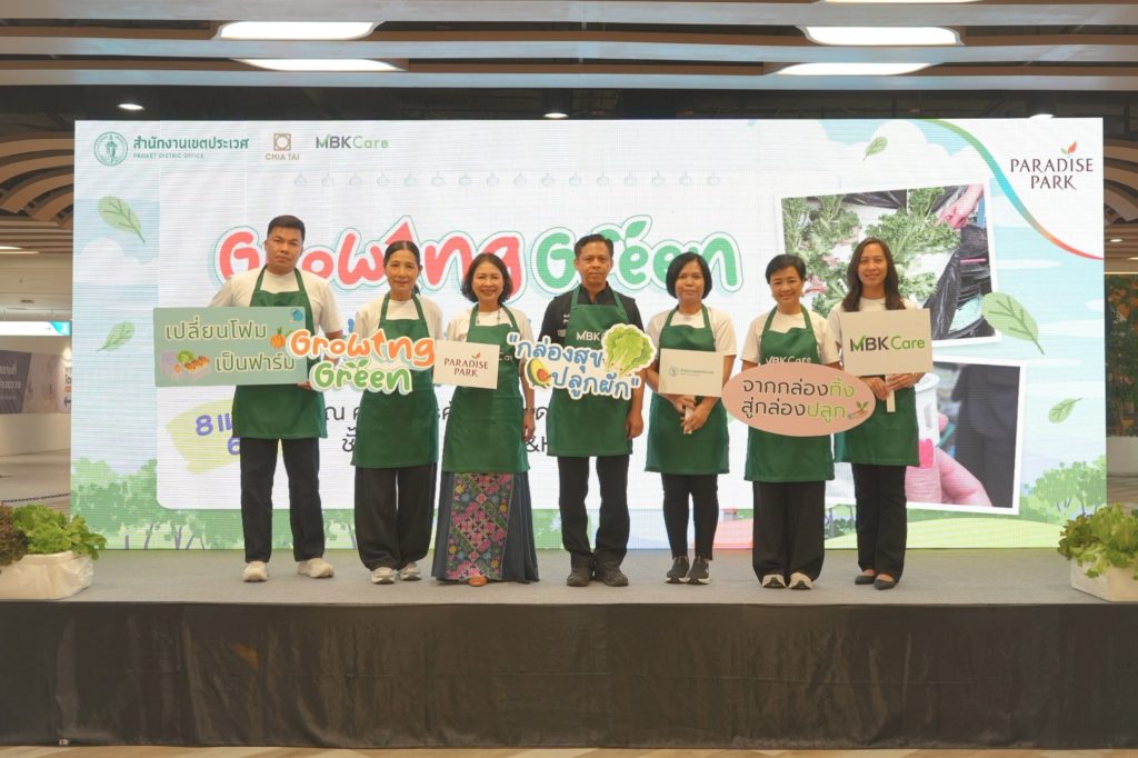 นางสาวจรูญรัตน์ สาลี กรรมการผู้จัดการ บริษัท พาราไดซ์ พาร์ค จำกัด กล่าวว่า “พาราไดซ์ พาร์ค ศูนย์การค้าในเครือเอ็ม บี เค มุ่งดำเนินธุรกิจควบคู่กับการดูแลสิ่งแวดล้อม ภายใต้แนวคิด MBK Care สำหรับกิจกรรม “กล่องสุข ปลูกผัก” (Growing Green) จัดร่วมกับ สำนักงานเขตประเวศ ไม่เพียงช่วยลดปริมาณขยะ แต่ยังเพิ่มพื้นที่สีเขียวและสร้างการมีส่วนร่วมของชุมชนอย่างเป็นรูปธรรม เราตั้งเป้ากิจกรรมนี้เป็นต้นแบบด้านการบริหารจัดการทรัพยากรในศูนย์การค้า และต่อยอดสู่การพัฒนาอย่างยั่งยืนในระยะยาว