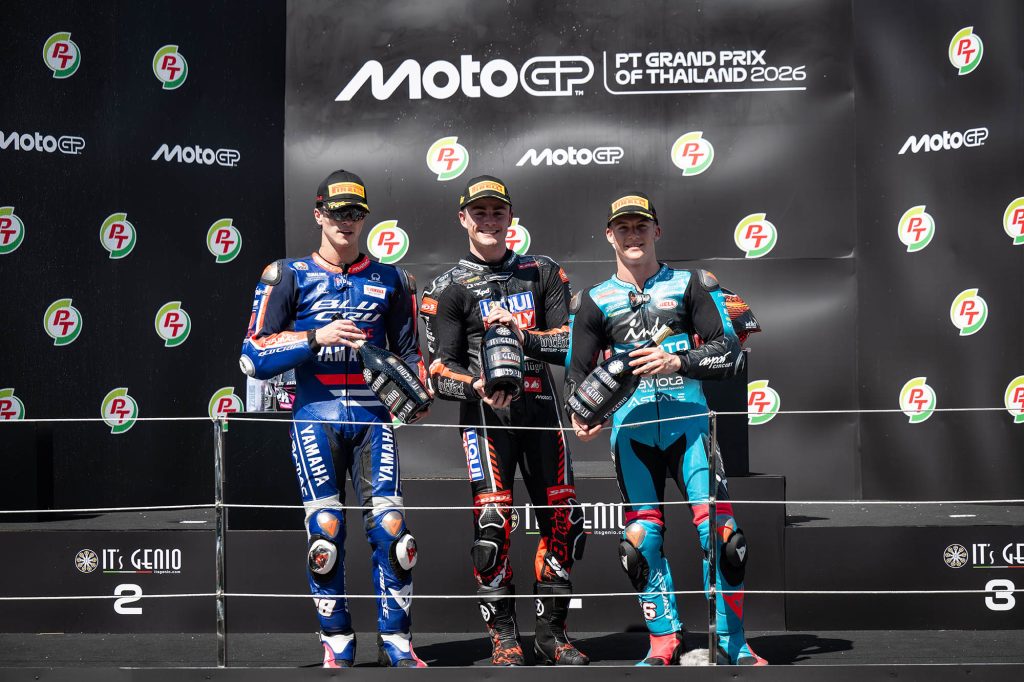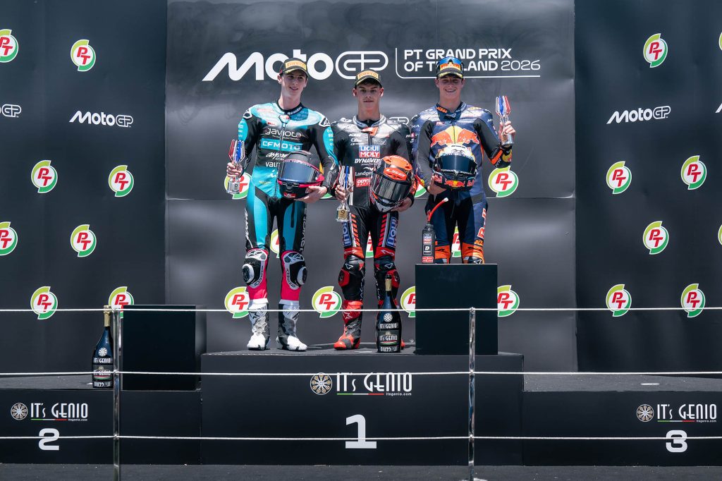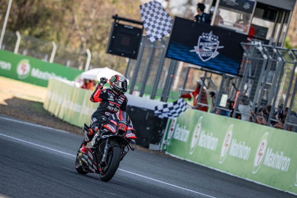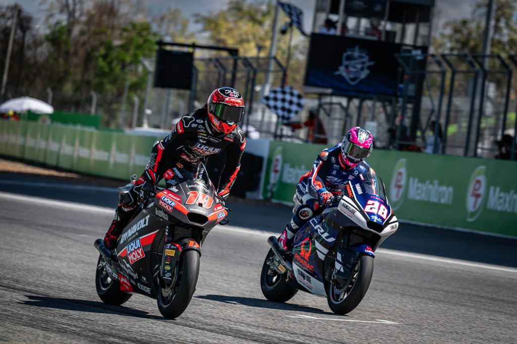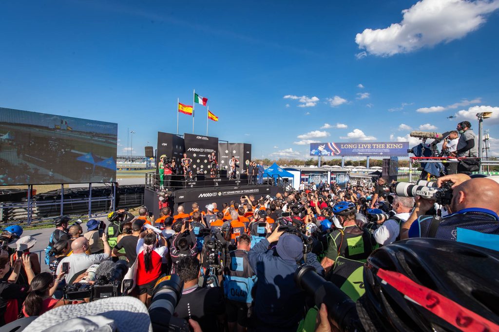 ศึกมอเตอร์สปอร์ตสองล้อเบอร์หนึ่งของโลก “โมโตจีพี” ดวลความเร็วสนามแรก ที่ประเทศไทย ภายใต้ชื่อรายการ “พีที กรังด์ปรีซ์ ออฟ ไทยแลนด์” กระหึ่มโลก ด้วยเกมสุดเร้าใจ มาร์โก เบซเซ็คคี ดาวบิดอิตาเลียนจาก อพริเลีย เรซซิ่ง แก้ตัวสำเร็จนำม้วนเดียวจบผงาดคว้าชัยประเดิมฤดูกาลใหม่เหนือ เปโดร อคอสต้า นักบิดสแปนิชจาก เคทีเอ็ม ขณะ มาร์ค มาร์เกซ แชมป์โลกคนปัจจุบันจาก ดูคาติ ดวงแตกยางระเบิดไม่จบเรซ โดยโมโตจีพี สนามประเทศไทยในครั้งนี้ เป็นปีที่ ทำลายสถิติ (Break Records ) ผู้ชมสูงสุดกว่าทุกปี จำนวนกว่า 228,228 คน