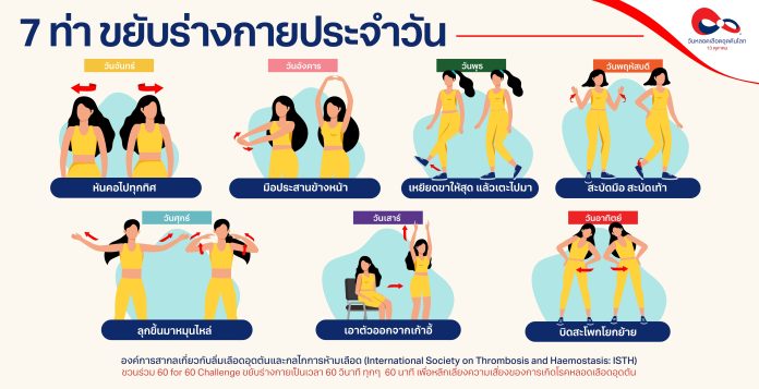 ISTH จึงได้เสนอแนวคิดการออกกำลังกายแบบใหม่มาชาเลนจ์ผู้คนทั่วโลก ให้ตระหนักและให้ความสำคัญของการขยับร่างกาย ภายใต้แคมเปญ “60 For 60 Fitness Challenge” เชิญชวนทุกคนขยับร่างกายง่าย ๆ เป็นระยะเวลาอย่างน้อย 60 วินาที ทุก ๆ 60 นาที ผ่าน 7 ท่าขยับร่างกาย สุขภาพดีตลอด 7 วัน ในธีม ‘สวัสดี’ เพื่อสร้างความตระหนักรู้และเผยแพร่ความรู้ และลดความเสี่ยงภาวะหลอดเลือดอุดตัน