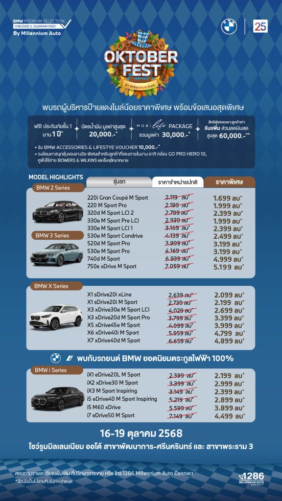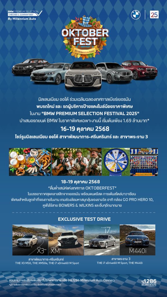 บริษัท มิลเลนเนียม ออโต้ กรุ๊ป จำกัด ผู้จำหน่ายรถยนต์ บีเอ็มดับเบิลยู, มินิ และ มอเตอร์ไซค์ บีเอ็มดับเบิลยู มอเตอร์ราด อย่างเป็นทางการในประเทศไทย ภายใต้บริษัท มิลเลนเนียม กรุ๊ป คอร์ปอเรชั่น (เอเชีย) จำกัด (มหาชน) หรือ MGC-ASIA จัดงาน ‘Oktoberfest by Millennium Auto’ ระหว่างวันที่ 16–19 ตุลาคม 2568 ณ โชว์รูม บีเอ็มดับเบิลยู มิลเลนเนียม ออโต้ สาขาพัฒนาการ-ศรีนครินทร์ และสาขาพระราม 3