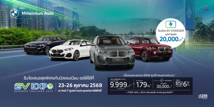 บริษัท มิลเลนเนียม ออโต้ กรุ๊ป จำกัด ผู้จำหน่ายรถยนต์ บีเอ็มดับเบิลยู, มินิ และ มอเตอร์ไซค์ บีเอ็มดับเบิลยู มอเตอร์ราด อย่างเป็นทางการในประเทศไทย ภายใต้บริษัท มิลเลนเนียม กรุ๊ป คอร์ปอเรชั่น (เอเชีย) จำกัด (มหาชน) หรือ MGC-ASIA จัดแสดงยนตรกรรม BMW ที่ขับเคลื่อนด้วยไฟฟ้าหลากรุ่น พร้อมจำหน่ายภายใต้ข้อเสนอสุดพิเศษที่งาน ‘BANGKOK EV EXPO 2025’ ระหว่างวันที่ 23-26 ตุลาคม 2568 ณ ฮอลล์ 7 ศูนย์การประชุมแห่งชาติสิริกิติ์ หรือรับข้อเสนอสุดคุ้มค่าได้ที่โชว์รูม บีเอ็มดับเบิลยู มิลเลนเนียม ออโต้ ทุกสาขาทั่วประเทศ