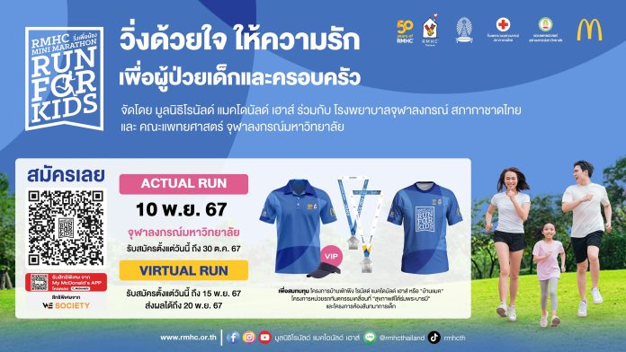 สภากาชาดไทย ชวนวิ่งด้วยใจเพื่อผู้ป่วยเด็กและครอบครัว ในงาน ‘RMHC Mini Marathon Run For Kids วิ่งเพื่อน้อง 2024’ ในวันอาทิตย์ที่ 10 พฤศจิกายน 2567 ณ จุฬาลงกรณ์มหาวิทยาลัย เพื่อระดมทุนสนับสนุนโครงการต่างๆ ภายใต้การดูแลของมูลนิธิฯ ได้แก่ โครงการบ้านพักพิง โรนัลด์ แมคโดนัลด์ เฮาส์ หรือ “บ้านแมค” ที่โรงพยาบาลจุฬาลงกรณ์ สภากาชาดไทย และ โรงพยาบาลรัฐที่ร่วมโครงการ, โครงการหน่วยรถทันตกรรมเคลื่อนที่ “สุขภาพดีใต้ร่มพระบารมี” และ โครงการห้องสันทนาการเด็ก