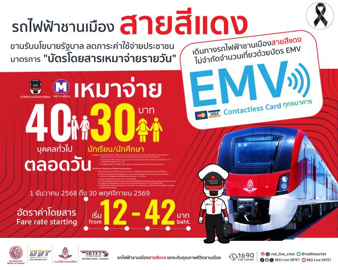 นายสุเทพ พันธุ์เพ็ง กรรมการผู้อำนวยการใหญ่ บริษัท รถไฟฟ้า ร.ฟ.ท. จำกัด ผู้ให้บริการรถไฟฟ้าชานเมืองสายสีแดง เปิดเผยว่า รฟฟท. พร้อมดำเนินการตามนโยบายรัฐบาล เพื่อช่วยลดภาระค่าใช้จ่ายให้แก่ประชาชน ”ดำเนินมาตรการ “บัตรโดยสารเหมาจ่ายรายวัน” สำหรับรถไฟชานเมืองสายสีแดง ทั้ง 2 เส้นทาง ได้แก่ สายธานีรัถยา ช่วงสถานีกลางกรุงเทพอภิวัฒน์ – สถานีรังสิต และสายนครวิถี ช่วงสถานีกลางกรุงเทพอภิวัฒน์ – สถานีตลิ่งชัน ร่วมกับ รถไฟฟ้ามหานคร สายฉลองรัชธรรม (MRT สายสีม่วง) โดยเตรียมจัดเก็บค่าโดยสารสูงสุด 40 บาท/วัน สำหรับประเภทบุคคลทั่วไป(Adult) และจัดเก็บค่าโดยสารสูงสุด 30 บาท/วัน สำหรับประเภทนักเรียน/นักศึกษา(Student) ซึ่งใช้บัตร MANGMOOM EMV บัตร EMV Contactless (บัตรเครดิต บัตรเดบิต) หรือ บัตร MRT EMV สำหรับเดินทางได้ทุกวัน ตั้งแต่เปิดให้บริการจนถึงปิดให้บริการ(05.00 – 24.00 น.) ซึ่งนโยบายดังกล่าวจะเริ่มใช้ตั้งแต่ วันที่ 1 ธันวาคม 2568 – 30 พฤศจิกายน 2569 หากผู้ใช้บริการมีการเดินทางในอัตราค่าโดยสารรวมทั้งวันต่ำกว่าอัตราเหมาจ่ายรายวัน จะจัดเก็บค่าโดยสารตามจริง และสำหรับกลุ่มผู้พิการ ผู้สูงอายุ เด็ก รวมถึงกลุ่มผู้ใช้สิทธิ์สวัสดิการแห่งรัฐ ยังคงได้รับส่วนลด หรือยกเว้นค่าโดยสารตามสิทธิประโยชน์เช่นเดิม