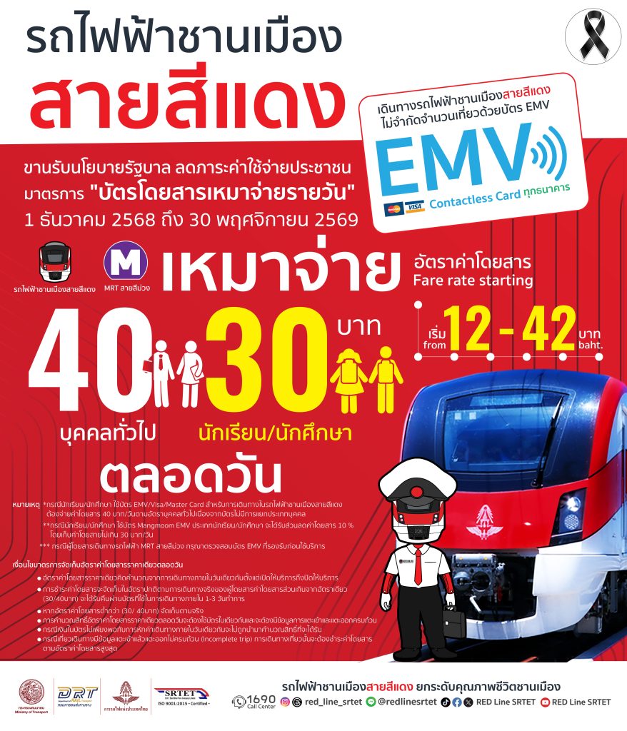 บริษัท รถไฟฟ้า ร.ฟ.ท. จำกัด ผู้ให้บริการรถไฟฟ้าชานเมืองสายสีแดง ดำเนินมาตรการ “บัตรโดยสารเหมาจ่ายรายวัน” สูงสุด ไม่เกิน 40 บาท ลดภาระค่าใช้จ่ายประชาชน ตามนโยบายรัฐบาล เริ่ม 1 ธ.ค. 68