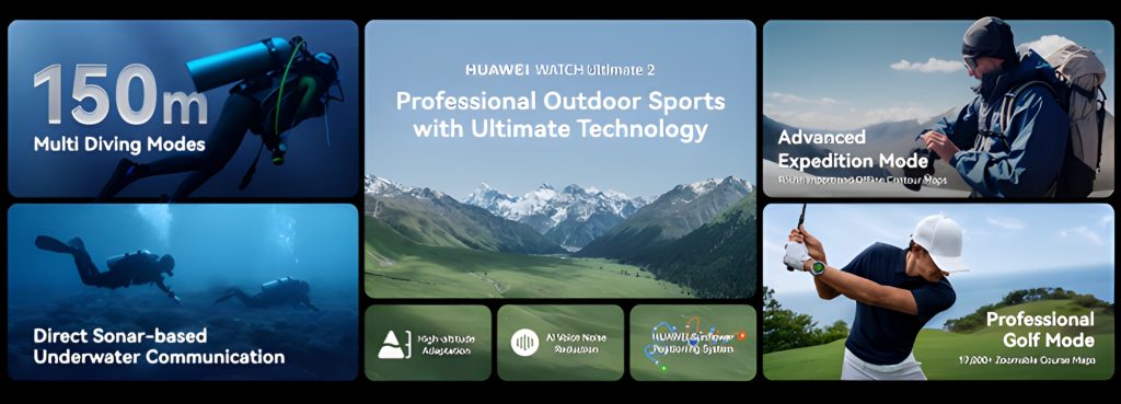 โดดเด่นด้วยความสามารถในการสวมใส่ดำน้ำลึกได้ สูงสุด 150 เมตร พร้อมระบบสื่อสารใต้น้ำที่ช่วยให้ผู้ใช้ส่งข้อความหรืออีโมจิผ่านคลื่นโซนาร์ได้ในระยะ 30 เมตร และสูงสุด 60 เมตรเมื่อเข้าใช้งานฟีเจอร์ SOS เสริมความปลอดภัยด้วยฟีเจอร์ขอความช่วยเหลือฉุกเฉินจากใต้น้ำ ตอบโจทย์นักดำน้ำและสายผจญภัยตัวจริง สำหรับสายออกกำลังกายกลางแจ้ง หัวเว่ยเพิ่มโหมด Trail Running และ Expedition Mode ที่รองรับการใช้งานแบบออฟไลน์ด้วยแผนที่นำทางกลับตามเส้นทางเดิม (Route-back) และการแจ้งเตือนความปลอดภัยเมื่ออยู่เหนือระดับความสูงกว่า 4,500 เมตร รวมถึง Golf Mode ที่ครอบคลุมกว่า 17,000 สนามทั่วโลก พร้อมระบบคำนวณระยะทางตามความชันและการมีแคดดี้ดิจิทัลส่วนตัวกับฟีเจอร์ Trajectory Replay