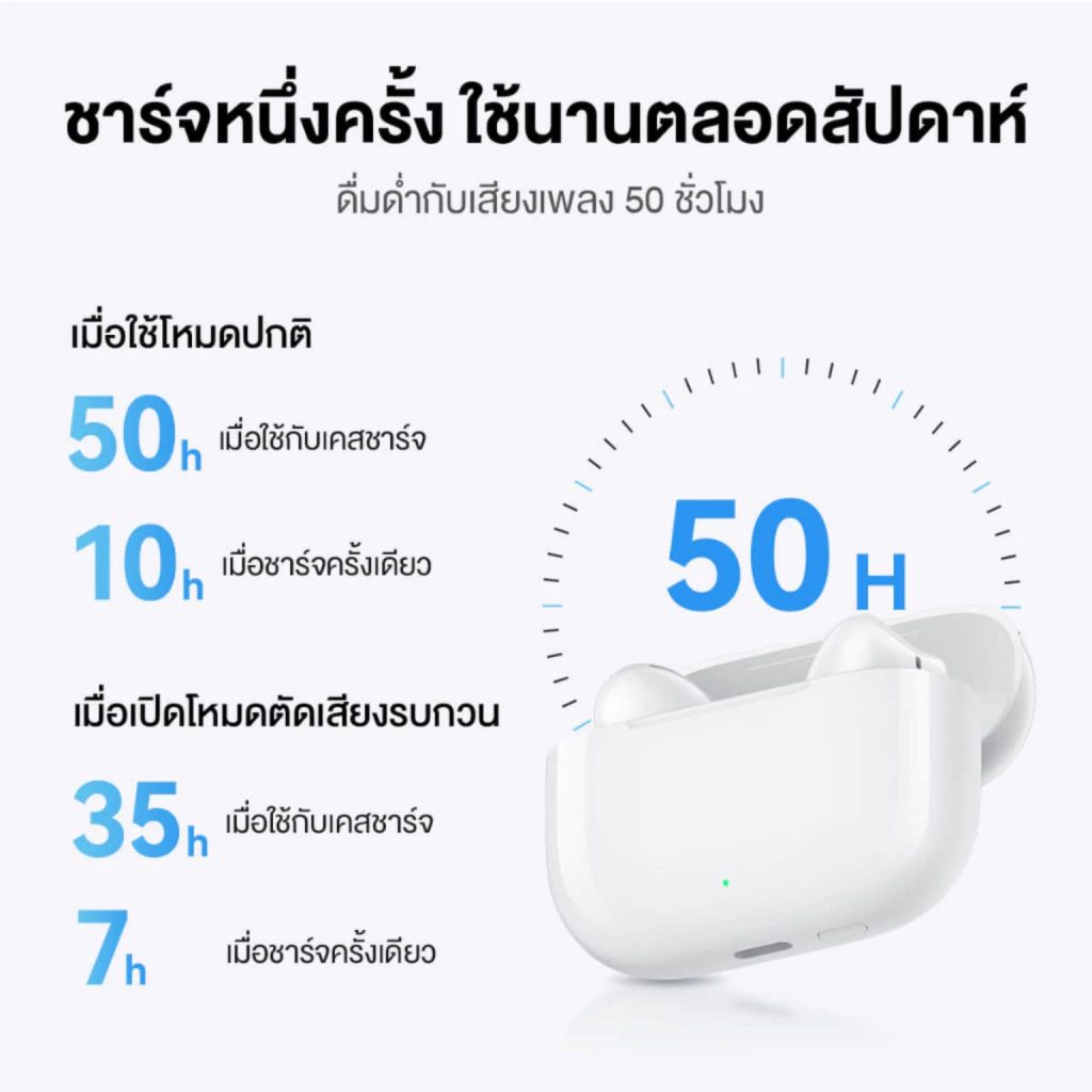 [1] ข้อมูลอายุการใช้งานแบตเตอรีมาจากการทดสอบในห้องปฏิบัติการของ Huawei ซึ่งมีการเล่นเสียงที่ระดับเสียง 50% และเมื่อปิดใช้งาน ANC ในโหมด AAC โดยมีเคสชาร์จทําหน้าที่เป็นแหล่งพลังงาน และขณะใช้ HUAWEI Pura 70 มีการใช้การตั้งค่าเริ่มต้นสําหรับคุณสมบัติอื่นๆ อายุการใช้งานของแบตเตอรีจริงอาจแตกต่างกันขึ้นอยู่กับระดับเสียง แหล่งกําเนิดเสียง การรบกวนจากสภาพแวดล้อม คุณลักษณะของผลิตภัณฑ์ และพฤติกรรมการใช้งาน
