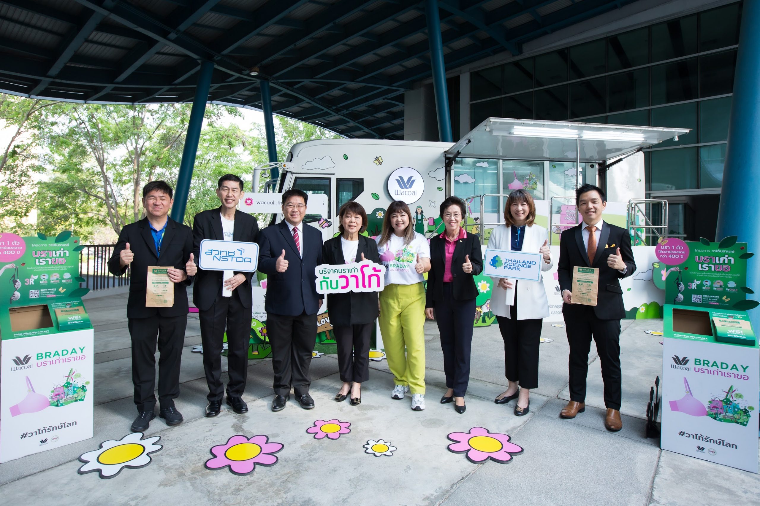 นางนงลักษณ์ เตชะบุญเอนก (ที่ 4 จากซ้าย) กรรมการบริหารสายงานสื่อสารองค์กรและกิจกรรมเพื่อสังคม นางอินทิรา นาคสกุล (ที่ 4 จากขวา) ผู้อำนวยการฝ่ายการตลาด บริษัท ไทยวาโก้ จำกัด (มหาชน) ร่วมด้วย น.สพ. สนัด วงศ์ทวีทอง (ที่ 2 จากซ้าย) รองผู้อำนวยการอุทยานวิทยาศาสตร์ประเทศไทย (อวท.) นายฉัตรชัย รัตนลาภ (ซ้ายสุด) ผู้อำนวยการฝ่ายอาวุโส ฝ่ายบริหารธุรกิจ และนางสาวจิดาภา ยมมะนา (ที่ 2 จากขวา) ผู้จัดการศูนย์บริการลูกค้า อวท. พร้อมด้วย รองศาสตราจารย์ ดร.เติมศักดิ์ ศรีคิรินทร์ (ที่ 3 จากซ้าย) ผู้อำนวยการศูนย์เทคโนโลยีโลหะและวัสดุแห่งชาติ (เอ็มเทค) และ ดร.ศราวุธ เลิศพลังสันติ (ขวาสุด) รักษาการรองผู้อำนวยการศูนย์เอ็มเทค ร่วมเปิดกิจกรรม “Wacoal Braday On Tour” รถบัสรับบริจาคชุดชั้นในเก่าหรือไม่ใช้แล้ว เพื่อนำไปกำจัดโดยการเผาอย่างถูกวิธี เพื่ออำนวยความสะดวกแก่เจ้าหน้าที่ สวทช. และสมาชิกประชาคมอุทยานวิทยาศาสตร์ประเทศไทยผู้ร่วมบริจาค รวมถึงกิจกรรมสนุกๆ ที่ให้ความรู้เข้าใจเกี่ยวกับโครงการวาโก้บราเดย์ บราเก่าเราขอ เป็นการร่วมภารกิจรักษ์โลกอย่างเข้มข้นและเป็นรูปธรรม นอกจากนี้ยังตั้งกล่องรับบริจาคชุดชั้นในเก่าหญิง-ชายทุกแบรนด์ตามจุดต่างๆ ในอุทยานวิทยาศาสตร์ฯ โดยกิจกรรมจัดขึ้น ณ สำนักงานพัฒนาวิทยาศาสตร์และเทคโนโลยีแห่งชาติ (สวทช.) อุทยานวิทยาศาสตร์ประเทศไทย คลองหลวง ปทุมธานี เมื่อเร็วๆ นี้