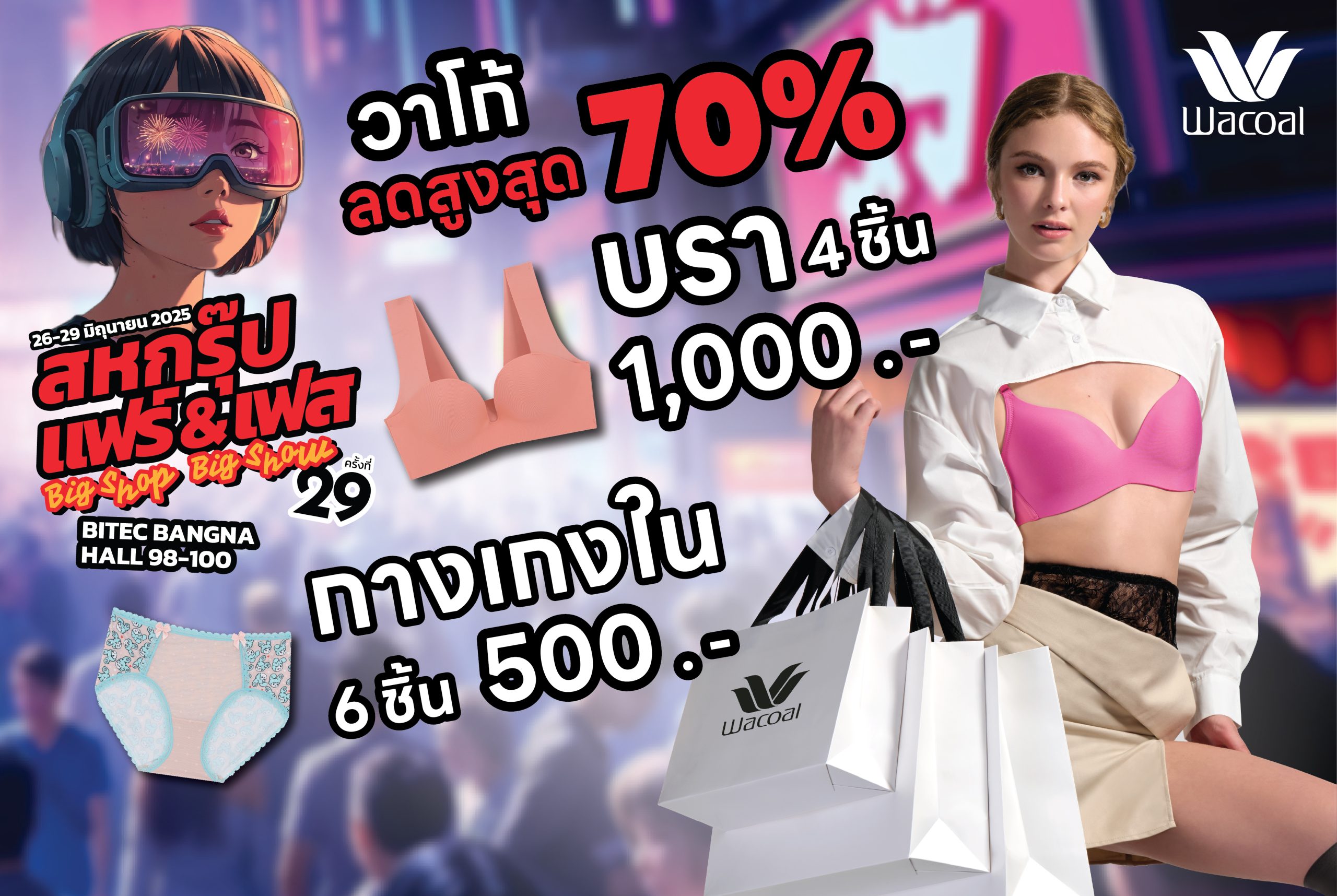 เตรียมตัวให้พร้อม! วาโก้ ขนทัพสินค้าแบรนด์ดังลดราคาสุดพิเศษ สูงสุด 70% อาทิ บราเริ่มต้น 290 บาท เซ็ต 4 ชิ้น 1,000 บาท Wacoal bloom/Wacoal Teen 250 บาท กางเกงใน 6 ชิ้น 500 บาท ชุดกระชับสัดส่วน ชุดนอนใส่สบาย และชุดออกกำลังกาย เริ่มต้นชิ้นละ 390 บาท ในงานสหกรุ๊ปแฟร์ ครั้งที่ 29 โดยความพิเศษในปีนี้ วาโก้มาในคอนเซ็ปต์ “PRIDE OF WACOAL” วาโก้ภูมิใจในสิ่งที่ทำ ภูมิใจในคุณภาพและนวัตกรรมสินค้า และภูมิใจที่ได้สวมใส่ชุดชั้นในที่ใส่ใจทั้ง “คุณและโลก” เพราะวาโก้ทุกชิ้นผ่านกระบวนการผลิตที่เป็นมิตรต่อสิ่งแวดล้อม ยังเปิดตัวคอลเลกชันใหม่ Wacoal X Sahred Toy เสื้อผ้าและสินค้าลวดลายผสมผสานความเชื่อมูเตลูกับแฟชั่นเข้าไว้ด้วยกัน อาทิ เสื้อทีเชิ๊ต เสื้อกล้าม กระเป๋าผ้า ร่มกันแดดกันฝน และGriptok เป็นต้น อีกหนึ่งไฮไลท์ที่ไม่ควรพลาดกับวาโก้แฟชั่นโชว์ ภายใต้คอนเซ็ปต์ “PRIDE OF WACOAL FASHION SHOW 2025” นำเสนอที่สุดของคอลเลกชันที่สะท้อนความภาคภูมิใจ ผ่านการถ่ายทอดจากนางแบบแถวหน้าของเมืองไทย