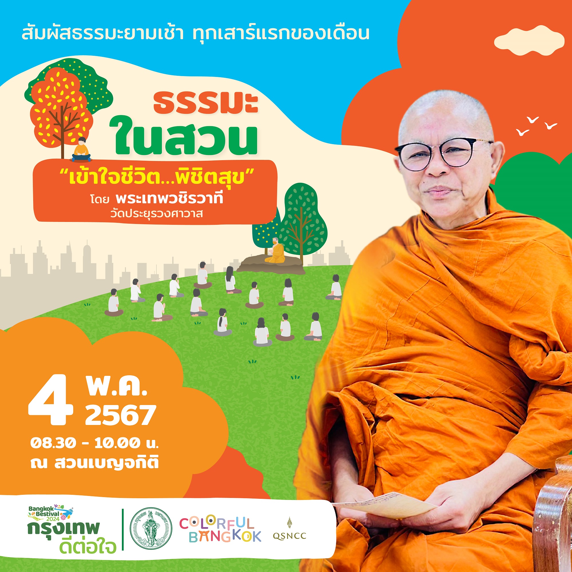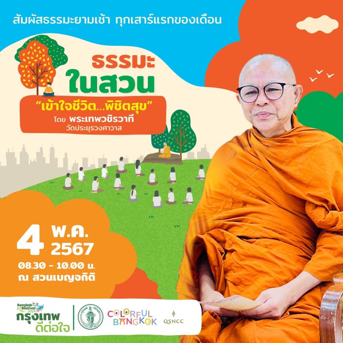 เนื่องในเดือนแห่งธรรมะวิสาขะ ศูนย์การประชุมแห่งชาติสิริกิติ์ ขอชวนทุกท่านมาร่วมหาคำตอบในการใช้ชีวิตให้มีความสุขไปกับกิจกรรม “ธรรมะในสวน” ฟังธรรมะหัวข้อ “เข้าใจชีวิต พิชิตสุข” พร้อมวิสัชนาธรรม ภายใต้บรรยายากาศที่ร่มรื่นของสวนเบญจกิติเพื่อค้นหาความสุขที่แท้จริงของชีวิตที่ไม่ต้องแสวงหา ด้วยตัวคุณเอง
