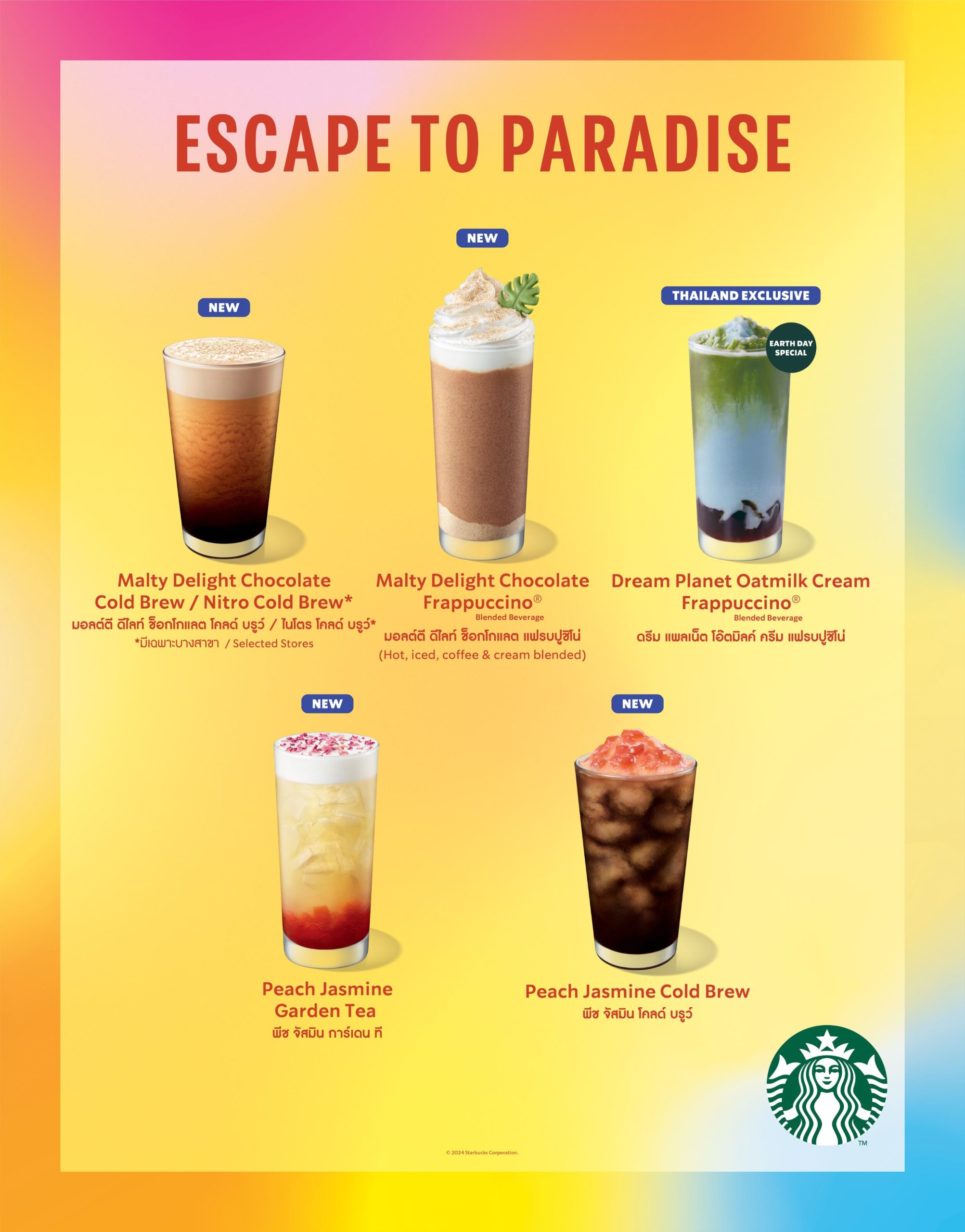 สตาร์บัคส์ ประเทศไทย ชวนคุณมาร่วมเฉลิมฉลองเดือนแห่งการรักษ์โลก Earth Month ด้วยเครื่องดื่มสุดพิเศษ ดรีม แพลเน็ต โอ๊ตมิลค์ ครีม แฟรบปูชิโน่ (Dream Planet Oatmilk Cream Frappuccino®) เมนูพิเศษเฉพาะในประเทศไทย ที่มาในคอนเซ็ปต์ “โลกในฝัน” ด้วยการนำนมทางเลือกจากพืชอย่างนมโอ๊ตผสมกับน้ำอัญชัญ ซึ่งเป็นตัวแทนของ “มหาสมุทร” ราดลงบนเจลลี่ชาเอิร์ลเกรย์ที่เป็นตัวแทน “พื้นดิน” และท็อปด้วยชาเขียวที่เป็นตัวแทนของ “ผืนป่า” โดยจะเริ่มจำหน่ายตั้งแต่วันที่ 17 เมษายน – 28 เมษายน 2567 ที่ร้านสตาร์บัคส์ทุกสาขาทั่วประเทศ พร้อมต้อนรับซัมเมอร์ด้วยเครื่องดื่ม มอลต์ตี ดีไลท์ ช็อกโกแลต แฟรบปูชิโน่ (Malty Delight Chocolate Frappuccino®) กาแฟผสมมอลต์และโกโก้ปั่นกับนม ราดลงบนผงนัทมอลต์ ท็อปด้วยวิปครีมที่โรยด้วยผงนัทมอลต์ หอมหวานไปกับกลิ่นนัตตี้จากมอลต์และโกโก้ ปิดท้ายด้วยช็อกโกแลตรูปใบไม้ ลูกค้าสามารถเลือกความอร่อยได้ทั้งรูปแบบร้อน เย็น ปั่น (ทั้งสูตรกาแฟและครีม) รวมถึงโคลด์บรูว์ และไนโตร โคลด์บรูว์ อีกด้วย อีกทั้งยังมี พีช จัสมิน การ์เดน ที (Peach Jasmine Garden Tea) ชาผสมผลไม้ ที่ได้ความหอมจากดอกไม้ กับชาอู่หลงคุณภาพเยี่ยม ผ่านการนำไปปั่นจนเกิดโฟมด้านบน ผสมด้วยซอสพีช จัสมิน ท็อปด้วยกลีบกุหลาบแห้ง เพิ่มความหอมให้กับชาในทุกครั้งที่ดื่ม พีช จัสมิน โคลด์ บรูว์ (Peach Jasmine Cold Brew) รสชาติหวานอมเปรี้ยวจากซอสพีชและจัสมินผสมผสานเข้ากันกับสตาร์บัคส์ โคลด์ บรูว์ เครื่องดื่มทั้งหมดนี้ จะเริ่มจำหน่ายตั้งแต่วันที่ 17 เมษายน – 3 มิถุนายน 2567 ที่ร้านสตาร์บัคส์ทุกสาขาทั่วประเทศ