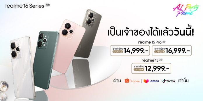 realme แบรนด์สมาร์ตโฟนเพื่อคนรุ่นใหม่ ประกาศวันวางจำหน่ายของ “realme 15 Series 5G” ในวันที่ 25 กันยายน ผ่านช่องทางอีคอมเมิร์ซ Shopee, Lazada และ Tiktok และ ในวันที่ 27 กันยายนนี้ ผ่าน realme Brand Shop ศูนย์จำหน่ายสมาร์ตโฟนชั้นนำ และศูนย์บริการโอเปอเรเตอร์ทั่วประเทศ ให้คุณเป็นเจ้าของ “AI Party Phone” ที่ยืนหนึ่งด้วย AI Edit Genie ฟีเจอร์แต่งภาพที่สั่งงานด้วยเสียงเป็นครั้งแรกของวงการ พร้อมจัดโปรโมชันสุดคุ้มจากโอเปอเรเตอร์ชั้นนำและพาร์ตเนอร์ทั้งหน้าร้านและออนไลน์