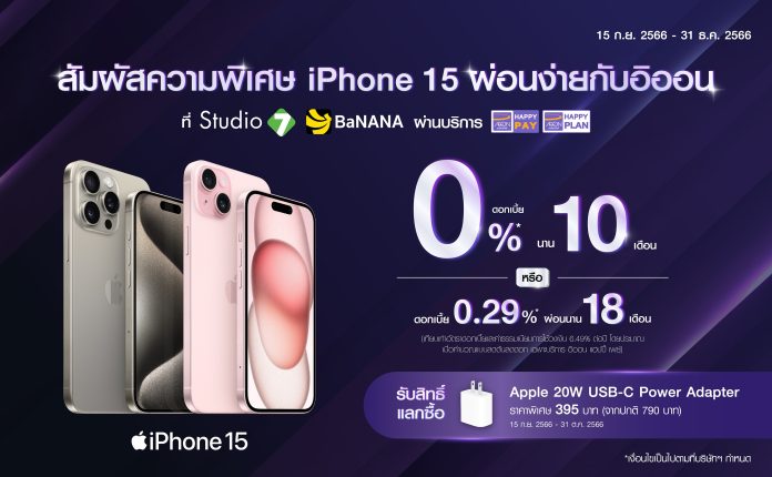 บริษัท อิออน ธนสินทรัพย์ (ไทยแลนด์) จำกัด (มหาชน) ให้คุณเป็นเจ้าของ iPhone 15 สมาร์ตโฟนสุดล้ำที่หลายคนรอคอยได้แบบสบายใจ กับโปรโมชัน “iPhone 15” ที่อิออนจัดเต็มมาเอาใจลูกค้าที่ซื้อ iPhone 15, iPhone 15 Plus, iPhone 15 Pro, iPhone 15 Pro Max ทุกรุ่น ทุกสี ทุกความจุ และเลือกผ่อนชำระด้วยบัตรอิออน ดอกเบี้ยผ่อนสบายเพียง 0% นาน 10 เดือน หรือเลือกผ่อนนาน 18 เดือน กับดอกเบี้ยพิเศษเพียง 0.29% ต่อเดือน ผ่านโปรแกรม “อิออน แฮปปี้ เพย์ และ อิออน แฮปปี้ แพลน”* รีบเป็นเจ้าของ iPhone 15 และชำระแบบสบายกระเป๋ากับอิออนได้แล้ว ที่ร้าน Studio7 และ Banana ทุกสาขาทั่วประเทศ ตั้งแต่วันนี้ ถึง 31 ธันวาคม 2566