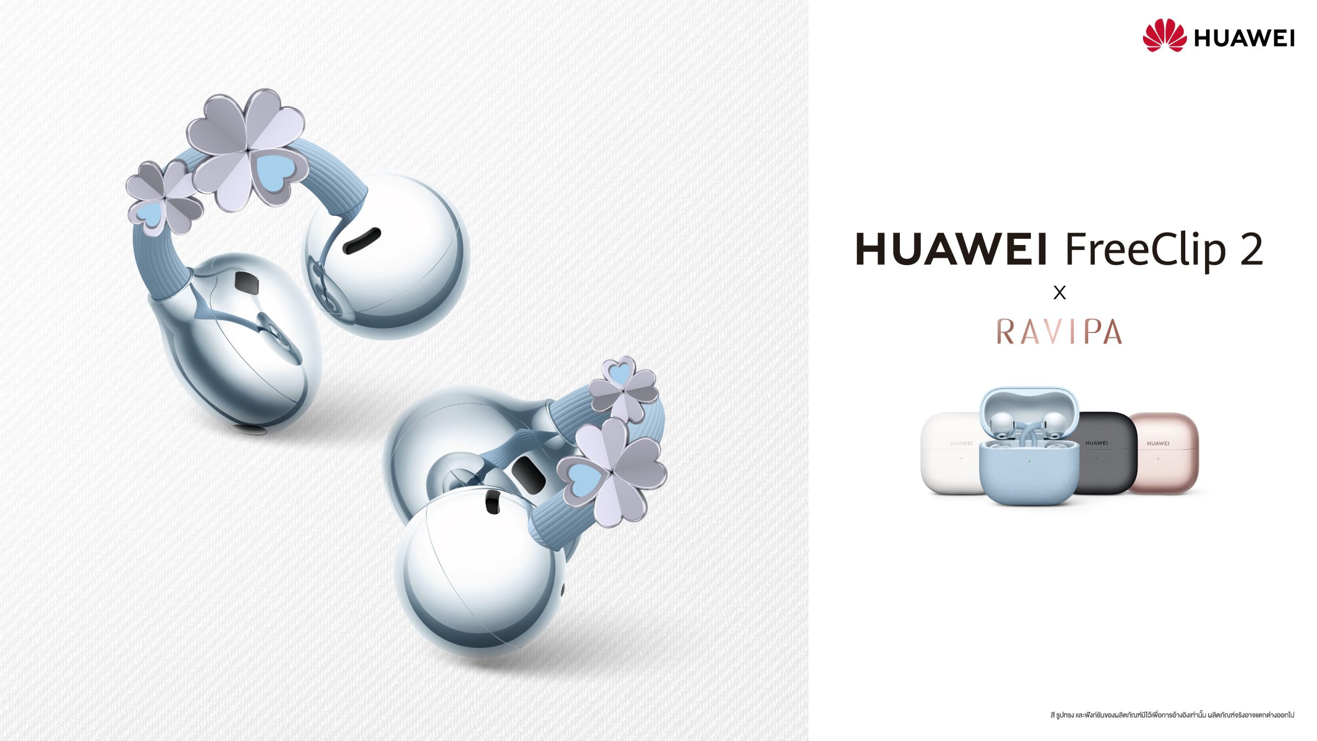 คอลเลกชันพิเศษ HUAWEI FreeClip 2 X RAVIPA คือการพบกันระหว่างนวัตกรรมเสียงอัจฉริยะของหัวเว่ย และงานออกแบบเชิงความหมายอันประณีตของ RAVIPA ที่เชื่อว่า “ทุกเสียงที่ได้ยิน สามารถกลายเป็นเรื่องราวดี ๆ ในชีวิตได้” หูฟังรุ่นนี้จึงไม่ได้ทำหน้าที่เพียงถ่ายทอดเสียงดนตรี แต่เปลี่ยนทุกช่วงเวลาการฟังให้เป็นพลังบวก ความมั่นใจ และความหมายที่อยู่ใกล้ตัวในทุกวัน โดยแรงบันดาลใจจาก RAVIPA ถูกถ่ายทอดลงสู่รายละเอียดของคอลเลกชัน ผ่านแนวคิดที่มองว่า เสียงดนตรีคือพลังแห่งความสุข การปกป้อง และความสำเร็จ ทุกเสียงที่ได้ยินจึงเปรียบเสมือนโชคดีที่กำลังเดินทางมาหาผู้สวมใส่ สะท้อนผ่านดีไซน์ทั้งหมด 4 เฉดสี ซึ่งแต่ละแบบแฝงความหมายพิเศษแตกต่างกัน ได้แก่
