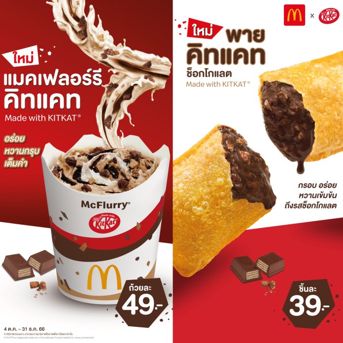 แมคโดนัลด์ ส่ง 2 เมนูอร่อยใหม่สุดว้าว! โดนใจช็อกโกแลตเลิฟเวอร์  ‘แมคเฟลอร์รี่ คิทแคท’ ไอศกรีมซอฟท์เสิร์ฟวานิลลา ปั่นกับซอสช็อกโกแลตฮอทฟัดจ์ ผสมคิทแคทชังก์ ให้สัมผัสอร่อย หวานกรุบเต็มคำ ในราคาเริ่มต้นเพียง 49 บาทและ ‘พายคิทแคท ช็อกโกแลต’ พายกรอบสีเหลืองทองร้อนๆ อัดแน่นไส้ช็อกโกแลตคิทแคทชังก์ หวาน หอม อร่อยเข้มข้นถึงรสช็อกโกแลต ราคาเริ่มต้นเพียงชิ้นละ 39 บาท