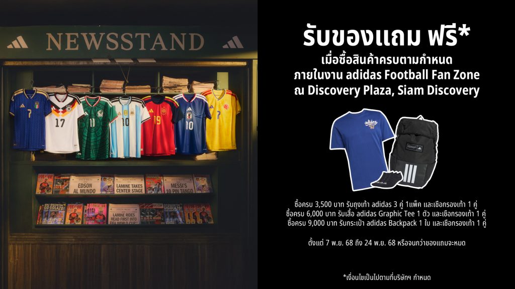 สำหรับ “adidas Football Fan Zone” เปิดให้แฟนบอลทุกคนได้เลือกซื้อเสื้อแข่งขันทีมชาติที่เข้าร่วมการแข่งขันฟุตบอลโลก 2026 และยังมี “STRIKEZONE” โซนสำหรับทดลองเตะลูกฟุตบอลทรีอนด้า ซึ่งเป็นลูกฟุตบอลแบบเดียวกับที่ใช้ในการแข่งขัน อีกทั้งยังมีกิจกรรมแจกของรางวัลอีกมากมายที่อาดิดาส จัดเต็มให้กับแฟนบอลตั้งแต่วันที่ 6 พฤศจิกายน 2568 – 3 มีนาคม 2569