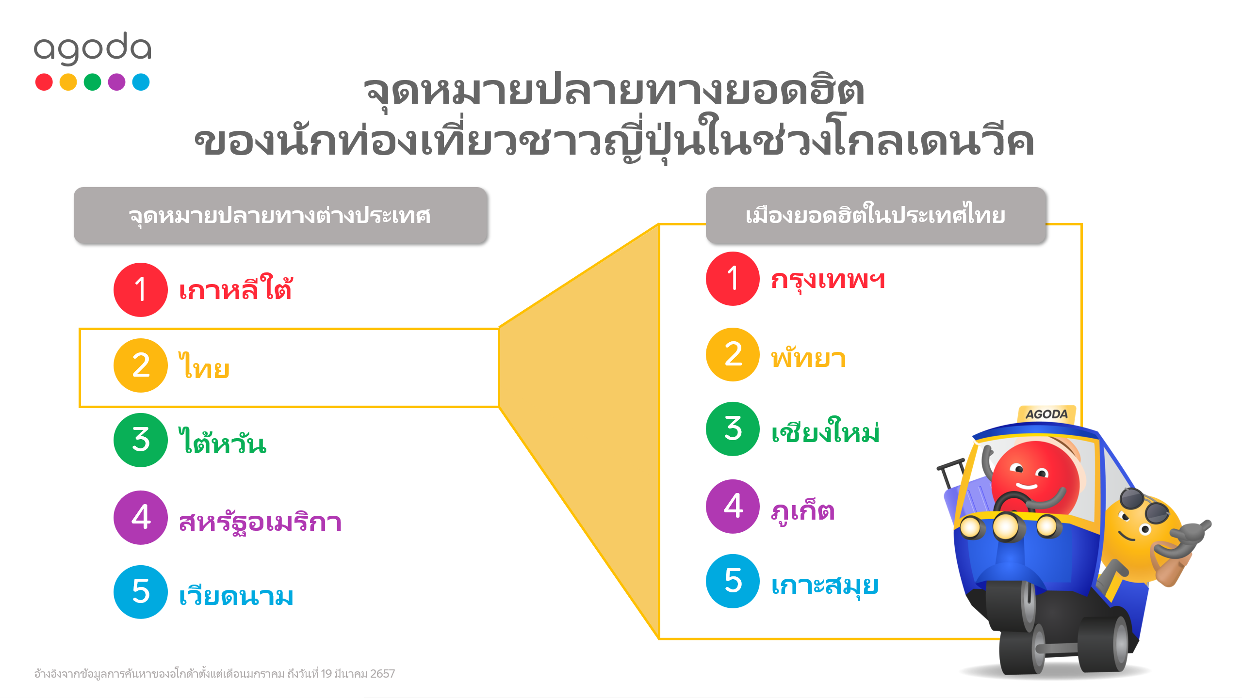 ข้อมูลเชิงลึกของอโกด้าแสดงให้เห็นว่าประเทศไทยเป็นที่นิยมมากขึ้นในหมู่นักท่องเที่ยวชาวญี่ปุ่น โดยมีการค้นหาเพิ่มขึ้น 60% ระหว่างเดือนมกราคมถึงช่วงกลางเดือนมีนาคมปี 2567 เมื่อเทียบกับช่วงเดียวกันในปี 2566 สะท้อนให้เห็นถึงความชื่นชอบของชาวญี่ปุ่นที่เพิ่มมากขึ้นต่อสถานที่ท่องเที่ยวอันหลากหลาย และวัฒนธรรมอันเก่าแก่ยาวนานของไทย