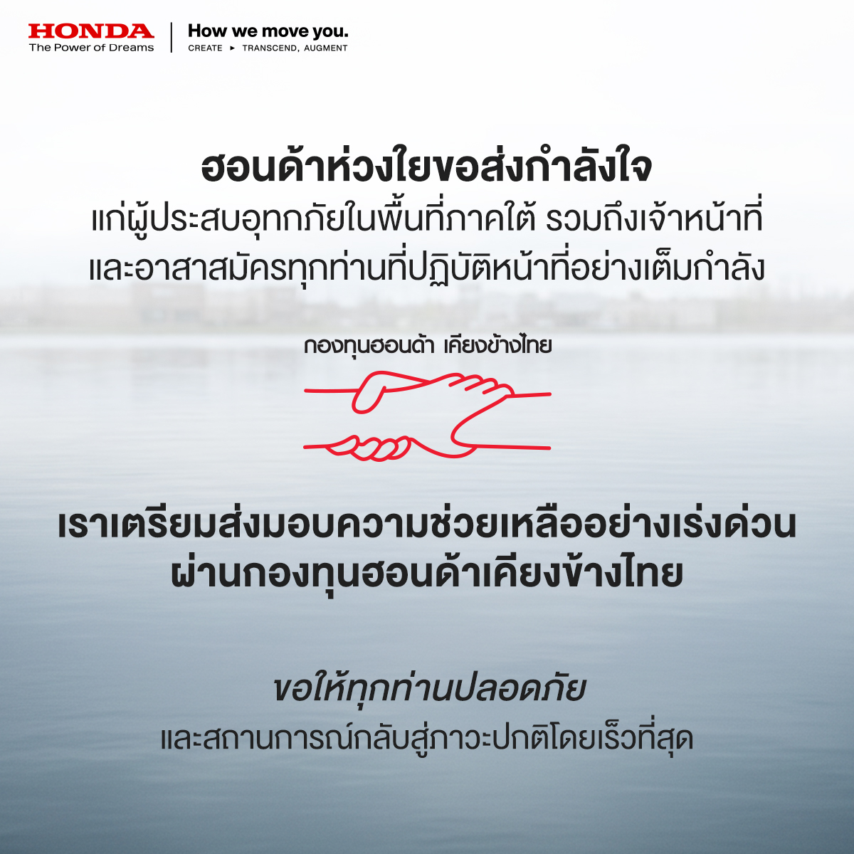จากสถานการณ์อุทกภัยที่ทวีความรุนแรง และส่งผลกระทบต่อการดำเนินชีวิตของประชาชนในหลายพื้นที่ทางภาคใต้ ณ ขณะนี้ บริษัท ฮอนด้า ออโตโมบิล (ประเทศไทย) จำกัด ขอแสดงความห่วงใยต่อผู้ประสบอุทกภัย พร้อมส่งกำลังใจถึงเจ้าหน้าที่และอาสาสมัครทุกท่านที่ทุ่มเทแรงกายแรงใจในการช่วยเหลืออย่างเต็มกำลัง