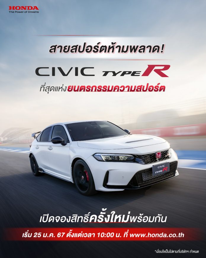 จากกระแสตอบรับที่ดีของแฟนๆ ฮอนด้าที่มีต่อ ฮอนด้า ซีวิค ไทป์ อาร์ (Civic Type R) ที่สุดแห่งยนตรกรรมความสปอร์ต วันนี้ ฮอนด้าเอาใจแฟนคลับสายสปอร์ตด้วยการประกาศเปิดรับจองสิทธิ์ในการเป็นเจ้าของ ฮอนด้า ซีวิค ไทป์ อาร์ ครั้งใหม่ อย่างเป็นทางการในวันพฤหัสบดีที่ 25 มกราคม 2567 เริ่มเวลา 10:00 น. เป็นต้นไป ผ่านทาง www.honda.co.th โดย ฮอนด้า ซีวิค ไทป์ อาร์ ที่เปิดจองครั้งใหม่นี้ จะเริ่มส่งมอบให้กับลูกค้าในเดือนเมษายน 2567 เป็นต้นไป