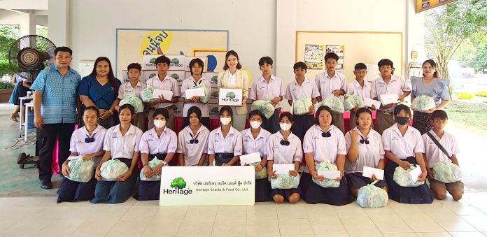 ในโอกาสนี้ เครือเฮอริเทจ ยังได้นำผลิตภัณฑ์ในเครือฯ อาทิ เครื่องดื่มน้ำนมอัลมอนด์แบรนด์ บลูไดมอนด์ อัลมอนด์ บรีซ เครื่องดื่มน้ำนมพิสทาชิโอแบรนด์ ซันคิสท์ เป็นต้น รวมถึงเครื่องอุปโภคบริโภคที่จำเป็น และยารักษาโรค มอบให้กับครอบครัวเด็กนักเรียนจำนวน 54 ครัวเรือน เพื่อเป็นการส่งเสริมคุณภาพชีวิตและบรรเทาค่าใช้จ่ายในครอบครัว ณ โรงเรียนหนองบัวปิยนิมิตร จังหวัดมหาสารคาม เมื่อวันก่อน