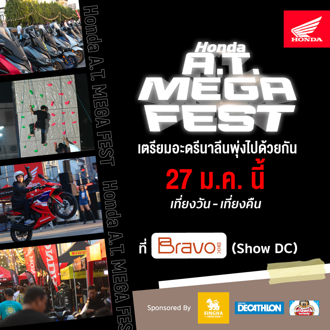 ไทยฮอนด้า เตรียมจัดงานมหกรรมครั้งยิ่งใหญ่แห่งปี ‘Honda A.T. Mega Fest 2024’ งานที่รวบรวมทุกความเป็นที่สุดของรถออโตเมติกฮอนด้าทุกรุ่น พร้อมดึงศิลปินชื่อดังระดับประเทศมาระเบิดความันส์ นำทีมโดยพรีเซนเตอร์ New Honda Giorno+ อย่าง ‘ณเดชน์-คูกิมิยะ’ และ ‘เจฟ-ซาเตอร์’ รวมถึงกิจกรรม Meet & Greet กับสุดยอดวงร็อก อย่าง ‘Three Man Down’ พร้อมขนทัพดารา ศิลปินอีกมาก อัดแน่นด้วยกิจกรรมให้ร่วมสนุกภายในงาน ตั้งแต่เวลาเที่ยงวันจนถึงเที่ยงคืน วันเสาร์ที่ 27 มกราคม 2667 ณ ศูนย์การค้า Bravo BKK (Show DC เดิม)