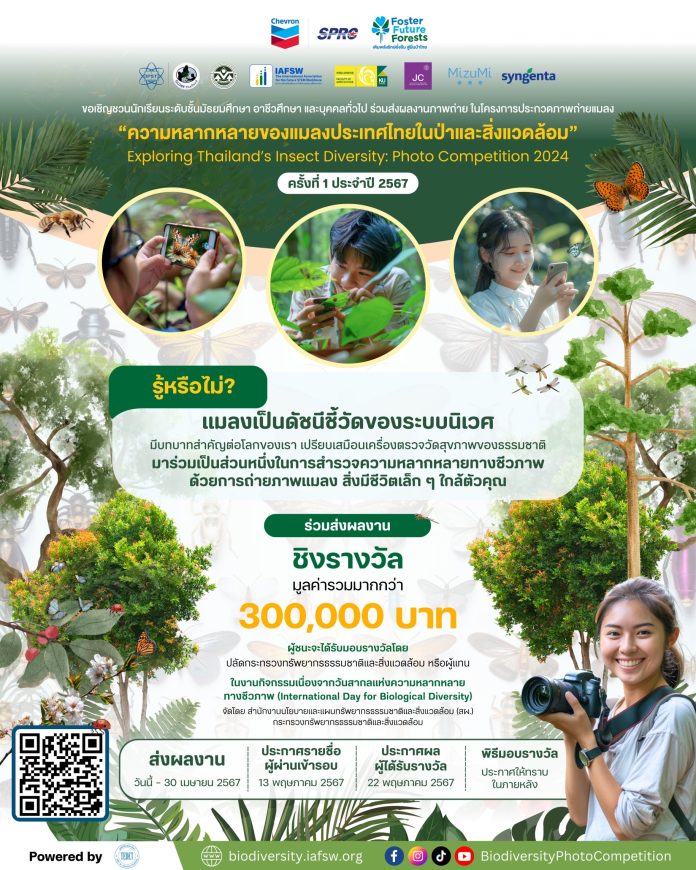 บริษัท เชฟรอนประเทศไทยสำรวจและผลิต จำกัด (เชฟรอน) และ บริษัท สตาร์ ปิโตรเลียม รีไฟน์นิ่ง จำกัด (มหาชน) (SPRC) ผู้ดำเนินโครงการ “เติมพลังรักษ์ยั่งยืน สู่ผืนป่าไทย Foster Future Forests” สานต่อภารกิจเพื่อสิ่งแวดล้อมและการศึกษาผ่านพลังของภาพถ่าย ผนึกกำลังพันธมิตร อันได้แก่ สมาคมส่งเสริมพัฒนากำลังคนสเตมเพื่ออนาคต (IAFSW), สำนักงานนโยบายและแผนทรัพยากรธรรมชาติและสิ่งแวดล้อม (ONEP), สถาบันส่งเสริมการสอนวิทยาศาสตร์และเทคโนโลยี (สสวท.), มหาวิทยาลัยเกษตรศาสตร์ และ มหาวิทยาลัยธรรมศาสตร์ เชิญชวนนักเรียนระดับชั้นมัธยมศึกษา อาชีวศึกษา และบุคคลทั่วไป ร่วมส่งผลงานในโครงการประกวดถ่ายภาพ “ความหลากหลายของแมลงประเทศไทยในป่าและสิ่งแวดล้อม (Exploring Thailand’s Insect Diversity: Photo Challenge)” ประจำปี 2567 เพื่อร่วมเฟ้นหาสุดยอดช่างภาพรุ่นใหม่ พร้อมส่งเสริมการเรียนรู้ด้านความหลากหลายทางชีวภาพและความสำคัญของแมลงในฐานะดัชนีชี้วัดของสิ่งมีชีวิต ชิงรางวัลมูลค่ารวมกว่า 300,000 บาท โดยสามารถส่งผลงานได้ตั้งแต่วันนี้ – 30 เมษายน 2567 ผ่าน https://biodiversity.iafsw.org หรือติดตามรายละเอียดเพิ่มเติมได้ที่ https://www.facebook.com/BiodiversityPhotoCompetition