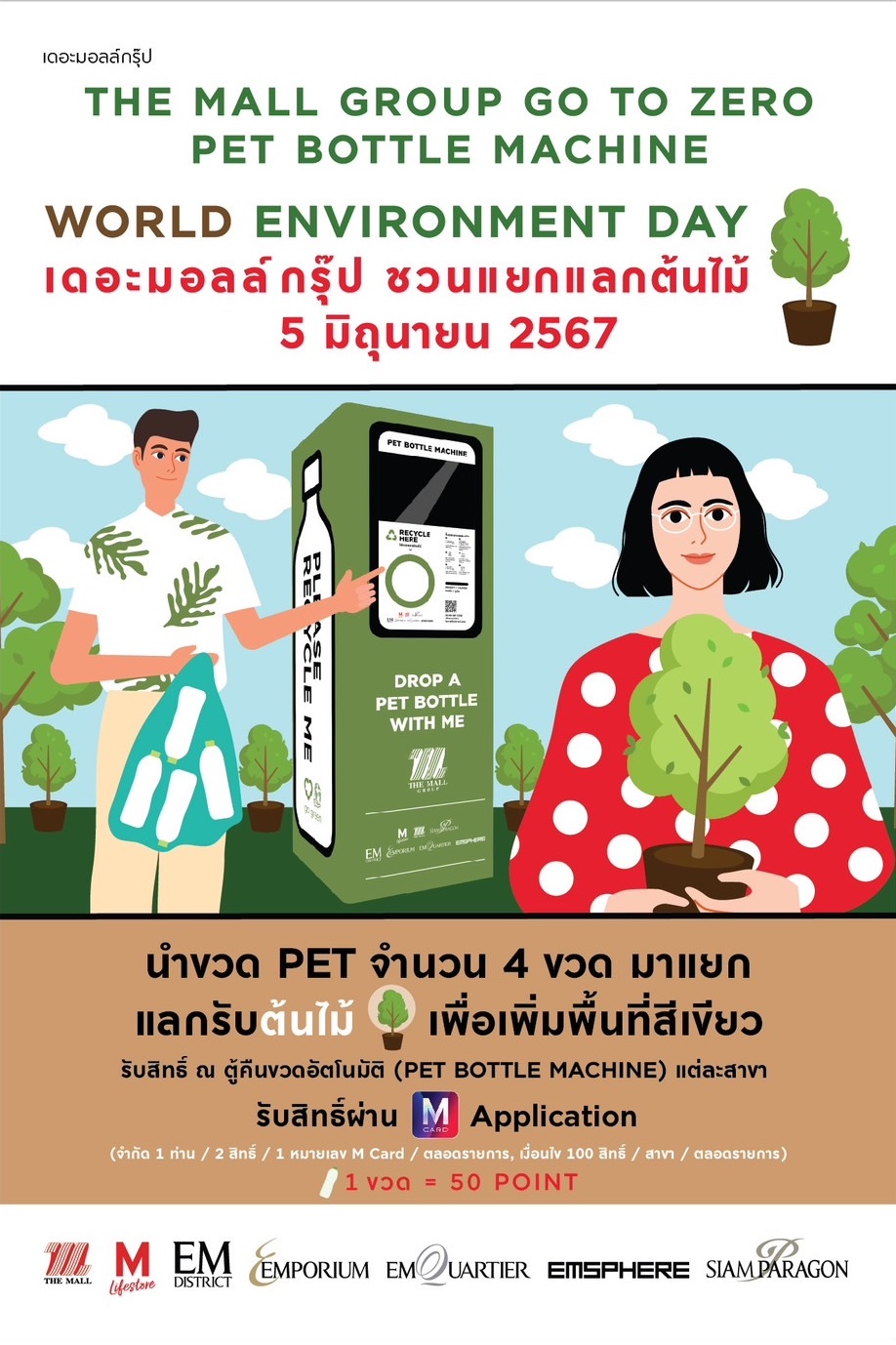 เดอะมอลล์ กรุ๊ป ขานรับนโยบายกระทรวงทรัพยากรธรรมชาติและสิ่งแวดล้อม โดยกรมการเปลี่ยนแปลงสภาพภูมิอากาศและสิ่งแวดล้อม ชวนประชาชน รักษ์โลก ภายใต้แนวคิด“Our land. Our future. We are #GenerationRestoration.” “พลิกฟื้นผืนดิน สู้วิกฤตภัยแล้ง” จัดกิจกรรม “เดอะมอลล์ กรุ๊ป ชวนแยกแลกต้นไม้” เพียงนำขวดพลาสติก PET จำนวน 4 ขวด มาหยอดตู้คืนขวดอัตโนมัติ (PET Bottle Machine) หรือแลก 200 คะแนน รับต้นไม้เพื่อเพิ่มพื้นที่สีเขียวฟรี เพื่อเป็นการนำพลาสติกกลับสู่กระบวนการรีไซเคิล เป็นการขับเคลื่อนระบบเศรษฐกิจหมุนเวียน (Circular Economy) เนื่องในวันสิ่งแวดล้อมโลก วันที่ 5 มิถุนายน 2567 ณ จุดบริการ ตู้คืนขวดอัตโนมัติ (PET Bottle Machine) ทุกสาขา