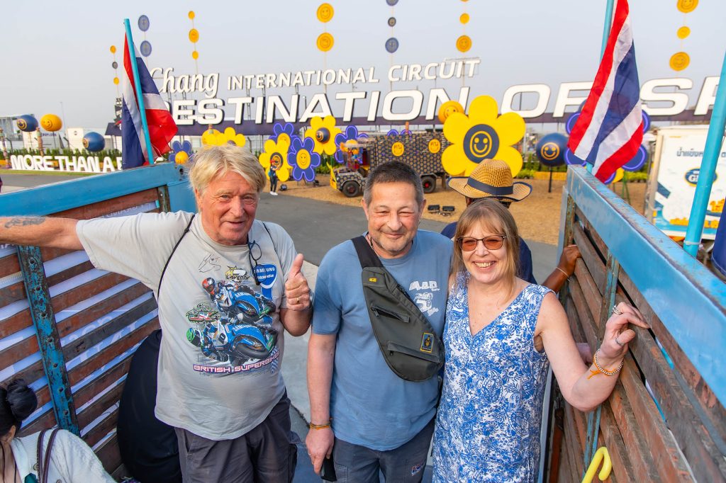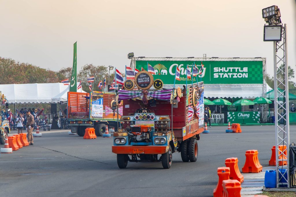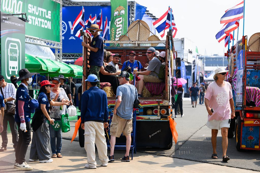 ป้าย Destination of Speed บริเวณทางเข้าสนาม กลายเป็นแลนด์มาร์กสำคัญที่ต้อนรับคนทั่วโลกที่มาเยือน บรรยากาศเต็มไปด้วยความคึกคัก จากกองทัพ “รถชัตเติ้นแต๋น” นับร้อยคัน พร้อมกับอาสาสมัคร “ฅนบุรีรัมย์” ที่คอยรับ-ส่ง ผนึกกำลังลำเลียงผู้ชมเข้าสู่พื้นที่สนามและสแตนด์เชียร์ต่างๆ อย่างไม่ขาดสาย